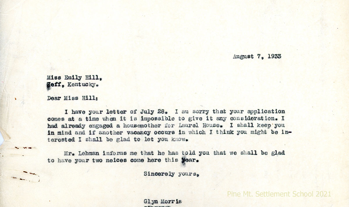 004 April 3, 1933. To Mr. (Glyn) Morrisi from Emily Hall, Hazard, Ky., enclosing an application blank and asking if the School will take her nieces in the fall if the “Board of Trustees don’t …limit your student body to only high school students. … I would love to have them in Pine Mt. School.”