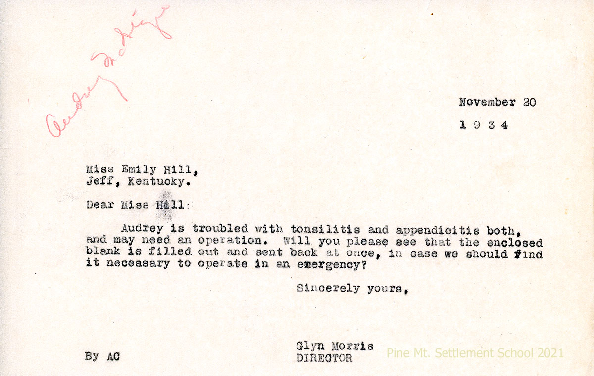 008 November 30, 1934. To Emily Hill from Morris (by AC), asking her to sign the enclosed blank in case of emergency operation for Audrey’s tonsillitis and appendicitis.