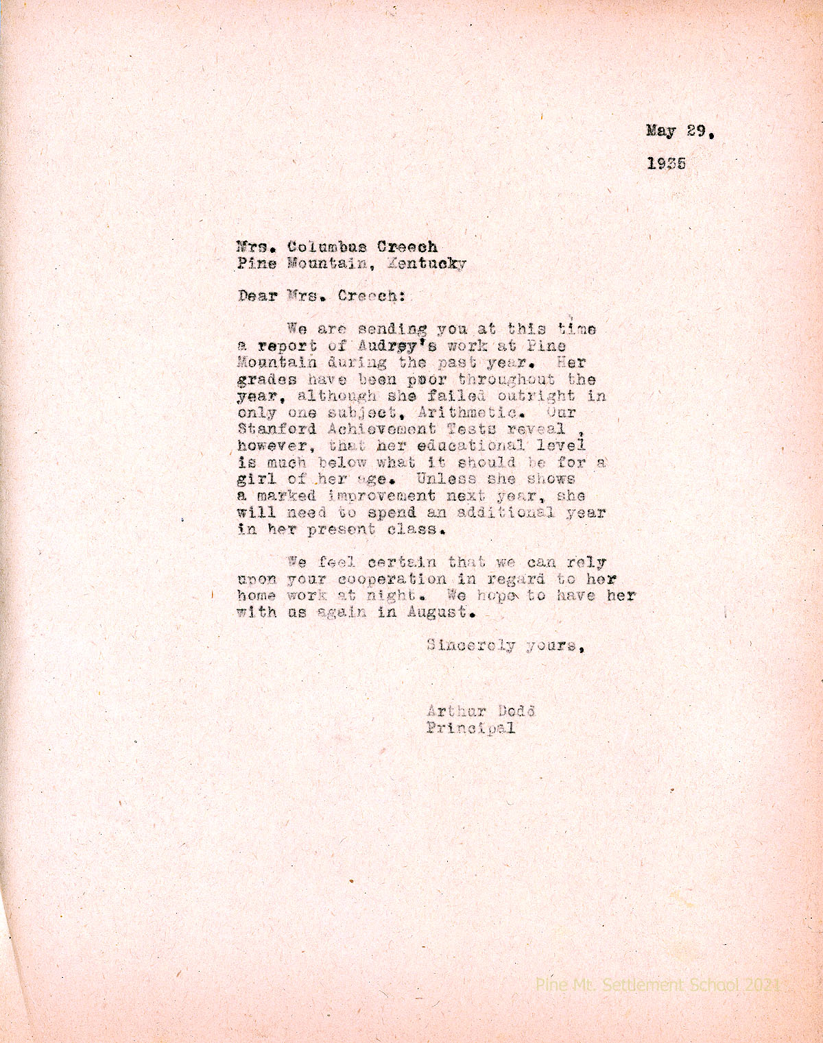 009 May 29, 1935. To Mrs. Columbus Creech (Emily Hill Creech), Pine Mountain, Ky., from Arthur Dodd, Principal, sending Audrey’s school report for the past year. Due to her poor grades, she may have to repeat her present class unless she improves.