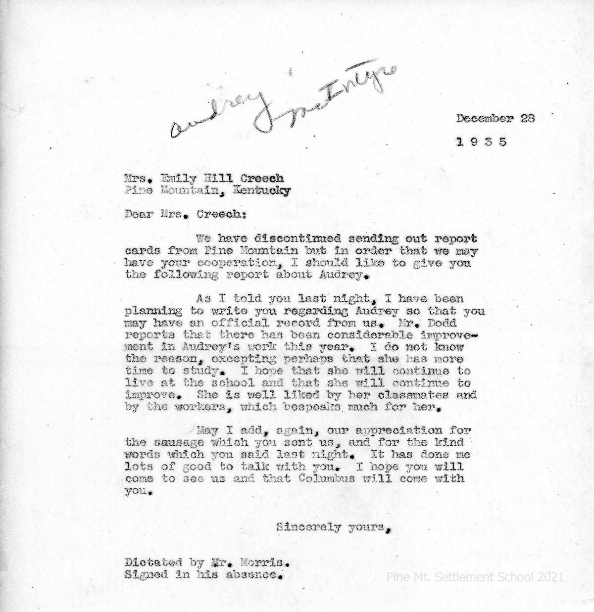010 December 28, 1935. To Emily Hill Creech from Morris, reporting on Audrey’s school work, since sending out report cards from PMSS has been discontinued. “Mr. Dodd reports that there has been considerable improvement in Audrey’s work this year. … I hope that she will continue to live at the school and that she will continue to improve. She is well liked by her classmates and by the workers, which bespeaks much for her.” Thanks Emily for the sausage and her kind words when they met last night.
