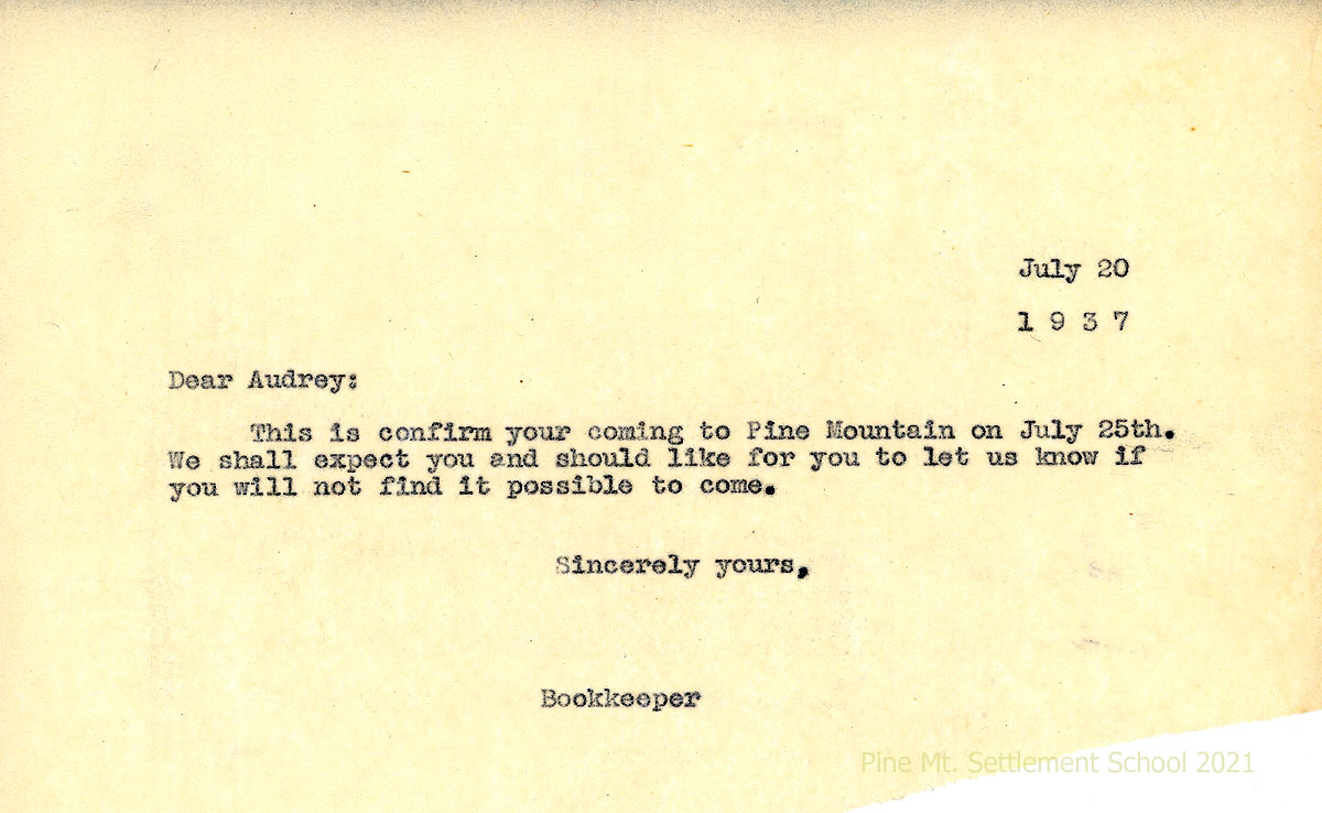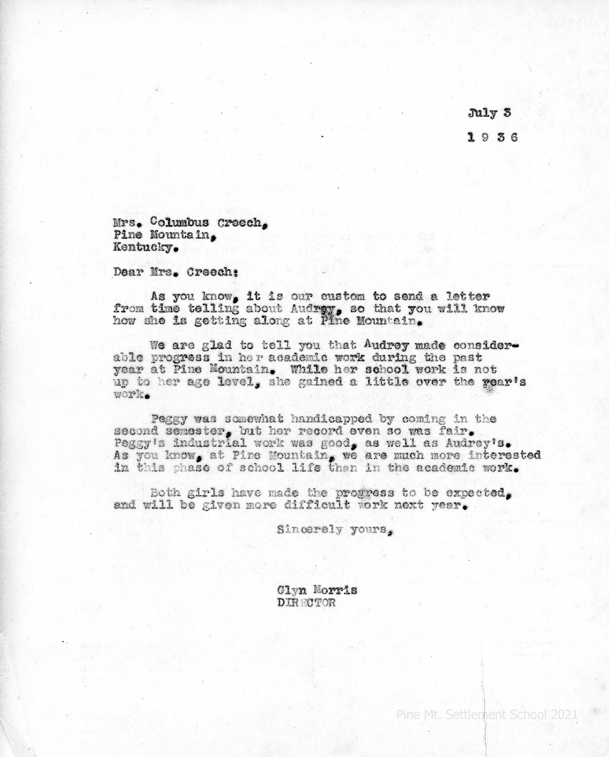 012 July 3, 1936. To Mrs. Columbus Creech from Morris, reporting that “Audrey made considerable progress in her academic work during the past year at Pine Mountain. … Peggy was somewhat handicapped by coming in the second semester, but her record even so was fair.” Both girls’ industrial work was good. “As you know, at Pine Mountain we are much more interested in this phase of school life than in the academic work.”