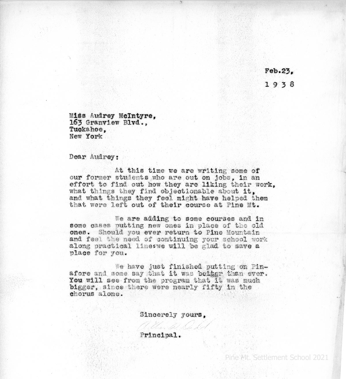 015 February 23, 1938. To Audrey in Tuckahoe, NY, from Arthur Dodd, Principal, who is asking former students who are employed about whether or not they like their work and what PMSS could have added to their curriculum that would have helped them. Mentions producing the play H.M.S. Pinafore with ”nearly fifty in the chorus alone.”
