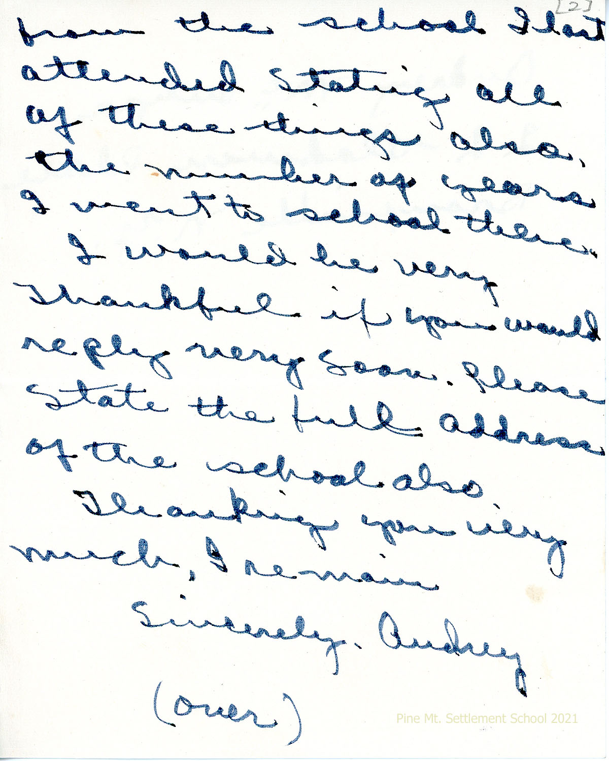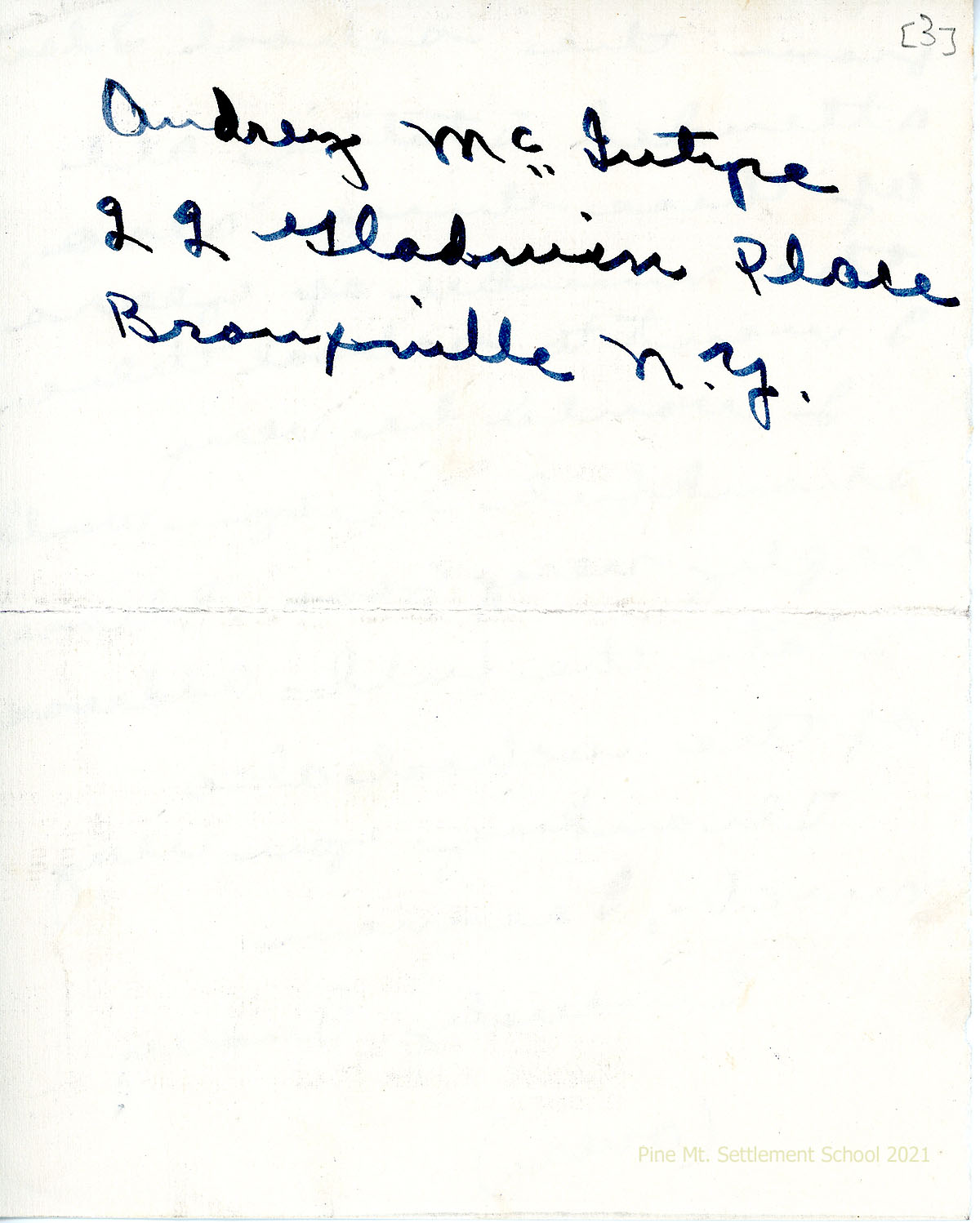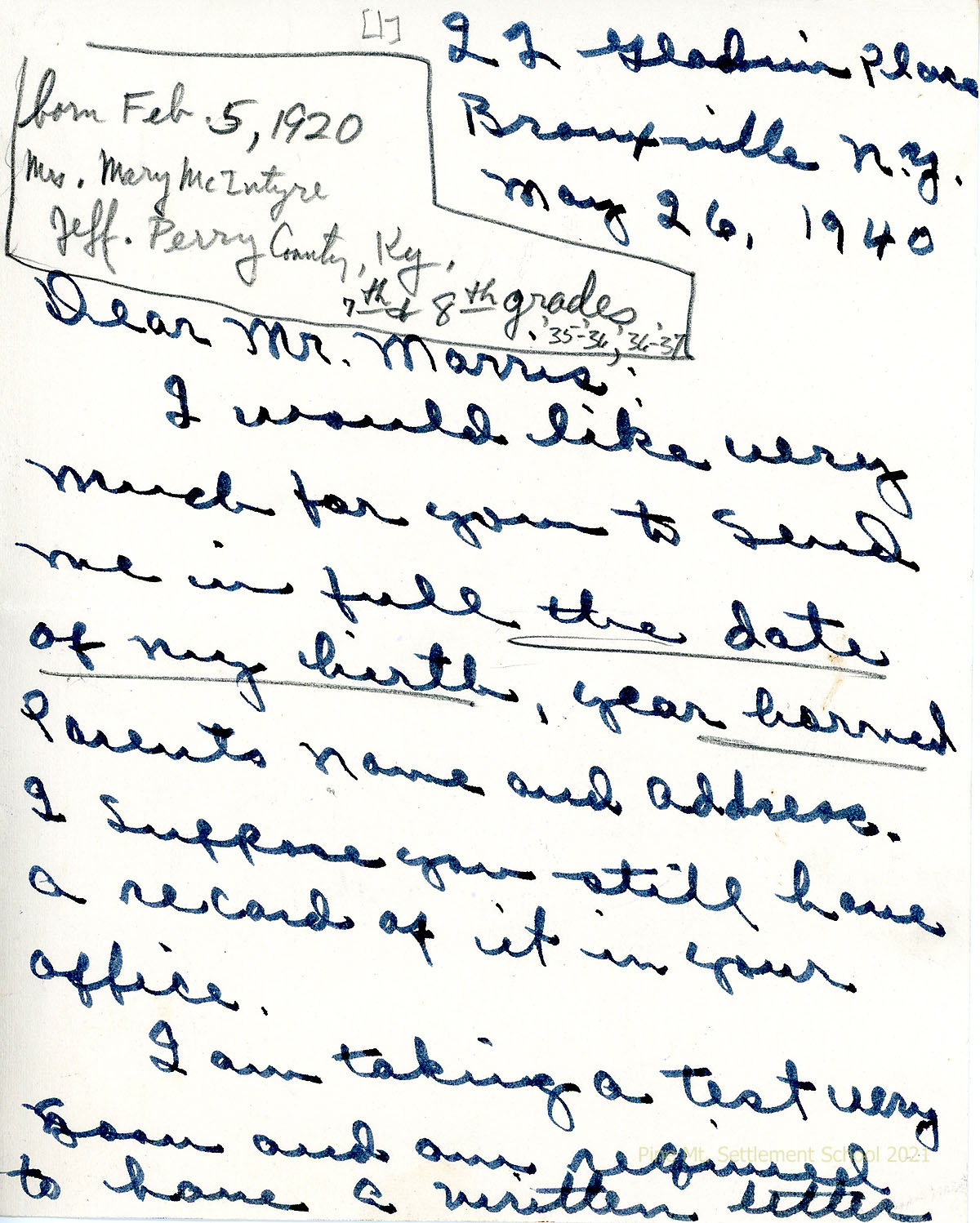 016-016b May 26, 1940. Three-page handwritten letter to Morris from Audrey McIntyre in Bronxville, NY, requesting information about her birth date, years at PMSS, and parents’ name and address. She needs a written letter from her school for a test she will be taking.