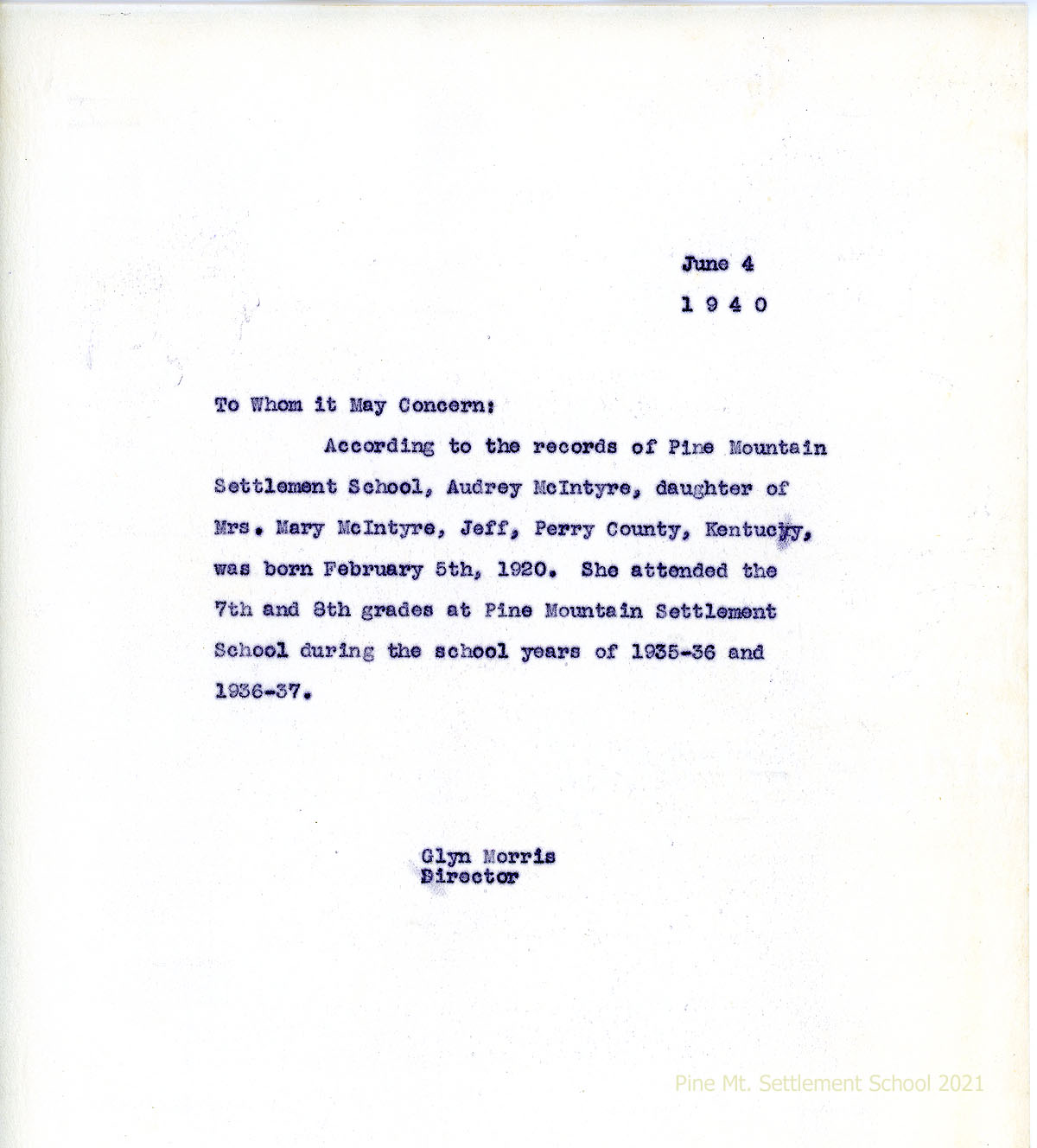 017 June 4, 1940. To “Whom it May Concern” from Morris. “According to the records of Pine Mountain Settlement School, Audrey McIntyre, daughter of Mrs. Mary McIntyre, Jeff, Perry County, Kentucky, was born February 5th, 1920. She attended 7th and 8th grades … during the school years of 1935-1936 and 1936-1937.”