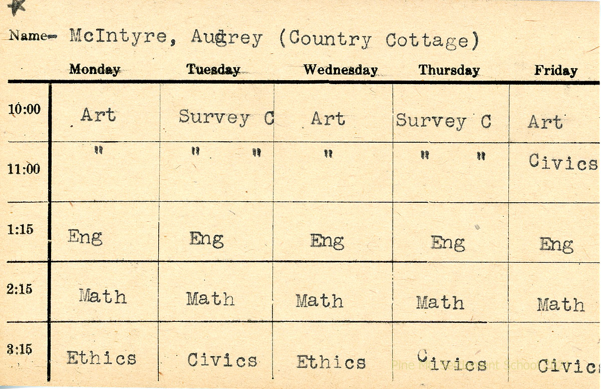 019 N.D. Class schedule for “McIntyre, Audrey (Country Cottage),” showing the times and days for Art, Survey C, Civics, English, Math, Ethics, and Civics.