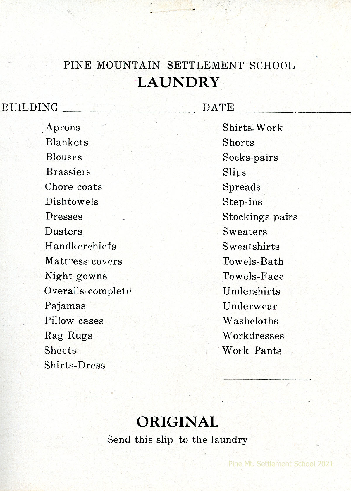020a N.D. Printed page titled “Pine Mountain Settlement School LAUNDRY,” headed by blanks for Building and Date, and listing two columns of various garments.