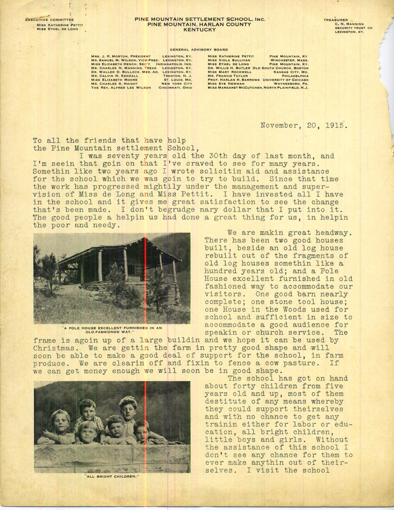 Letterhead lists names of Executive Committee members, Treasurer, and members of the General Advisory Board. William Creech writes that at 70 years old he’s seeing his cravings of many years coming true. Work has progressed in the two years since he asked for the school under management of Miss [Ethel] de Long and Miss [Katherine] Pettit. Creech describes the various buildings that have been constructed or are underway. There are about 40 students from five years old and up who would have no chance in life without the school ;