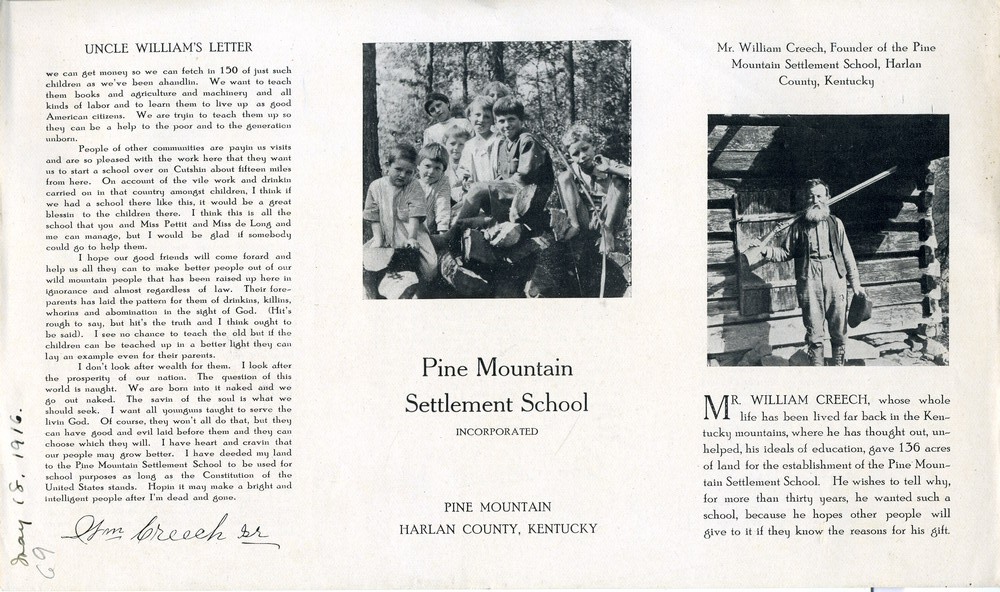 UNCLE WILLIAM’S LETTER Dated November 20, 1915. William Creech writes that at 70 years old he’s seeing his cravings of many years coming true. Work has progressed in the two years since he asked for the school under management of Miss de Long and Miss Pettit. Creech describes the various buildings that have been constructed or are underway. There are about 40 students from five years old and up who would have no chance in life without the school ; Creech visits the school nearly every day and sees much progress in the care of the children. He and the others hope for money to have 150 children at the school. He describes what they would learn. Cutshin people also want a school. Creech hopes friends will help the younger generation of mountain people have a better life. He has deeded his land to the school for that purpose. Signed by William Creech, Sr.