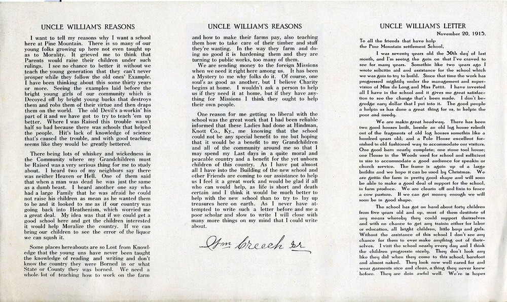 UNCLE WILLIAM’S REASONS A photo of William Creech and an introductory paragraph precedes his narrative. William Creech lists the reasons he wanted a school at Pine Mountain: to teach the area children morality so they can avoid bad influences and habits; to teach how to make farming profitable. He states that charity begins at home and knows the school would benefit his grandchildren, the community and future children. He has donated a liberal amount of land because the “ladies” had done great work at Hindman.
