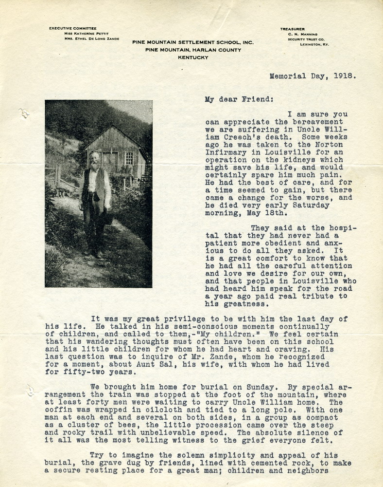 Ethel de Long Zande writes to friends of PMSS about Uncle William Creech’s death on May 18 at Norton Infirmary, Louisville ; description of his last day ; description of burial ; words of tribute to William Creech ; created a fund in his name ; description of William Creech’s grave ; signed Ethel de Long Zande ;