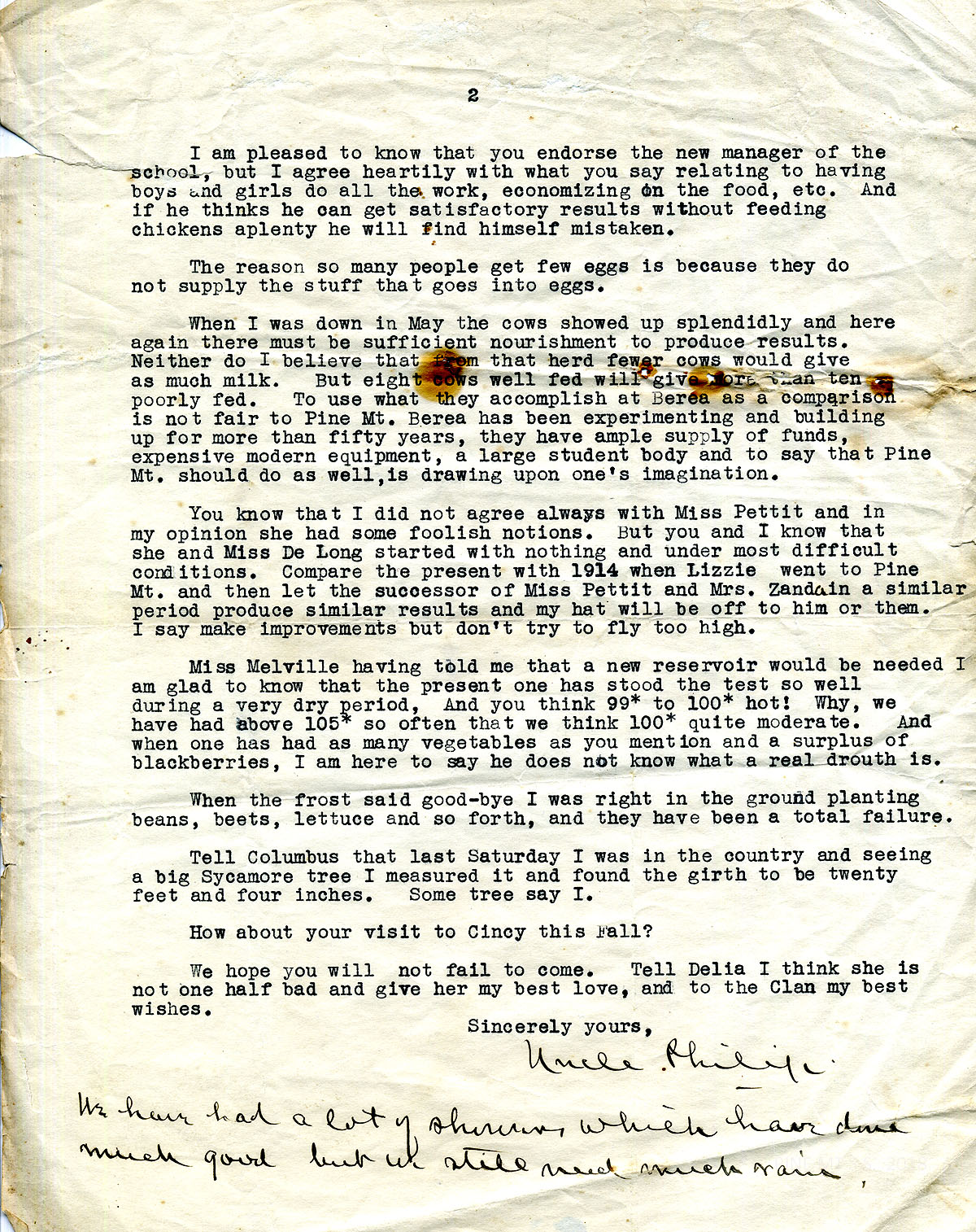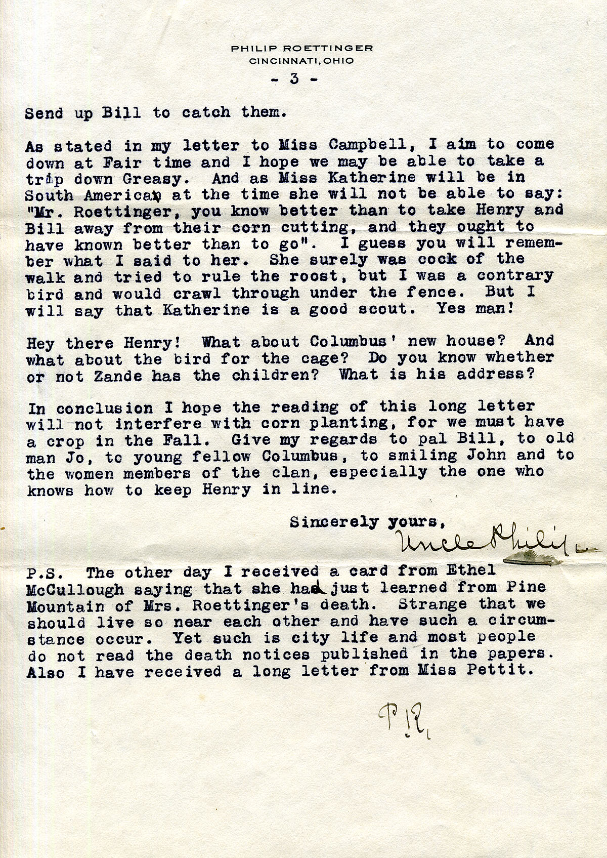 002-003 August 15, 1930. Two-page letter to Henry Creech from “Uncle Philip” [Roettinger], Cincinnati, OH, [002] who reacts to Henry’s news about his brother, Columbus Creech, ”the mountain girl who is going to Louisville to study medicine,” comments about Henry and Delia’s two daughters. “…[S]o long as the mountain people need qualified teachers, doctors and others, those who become so qualified should return to the home field….” [003] Roettinger states his opinions on the “new manager of the school.” needs of the farm animals, Katherine Pettit, and Ethel de Long Zande, and the reservoir. He suggests, “…make improvements but don’t try to fly too high.”