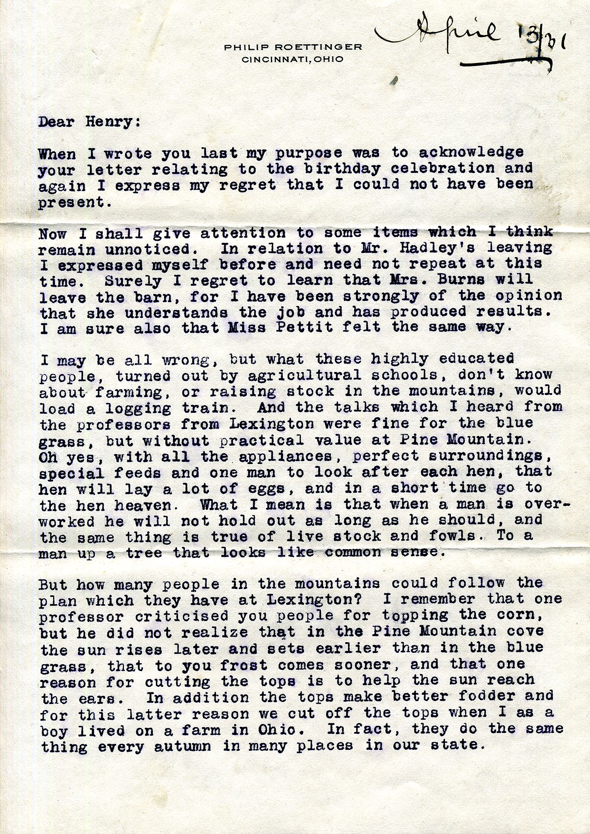 004-004b April 13, 1931. Three-page letter to Henry from “Uncle Philip” [Roettinger], [004] who comments on the departures of Mr. [Hubert] Hadley and Mrs. [Martha] Burns, the “highly educated people” who lack knowledge of farming or raising stock in the mountains, [004a] He feels that “H.C.C.” (Henry C. Creech) should be the farm manager, instead of a farmer from Denmark. He encloses a copy of his letter to Miss Campbell; mentions his sons, Dick and Philip, his gardening, [004b] and “Miss Katherine.” He asks for updates on Columbus’ new house and Luigi Zande. He sends his regards to his “pal Bill, to old man Jo, to young fellow Columbus, to smiling John and the women members of the clan….”