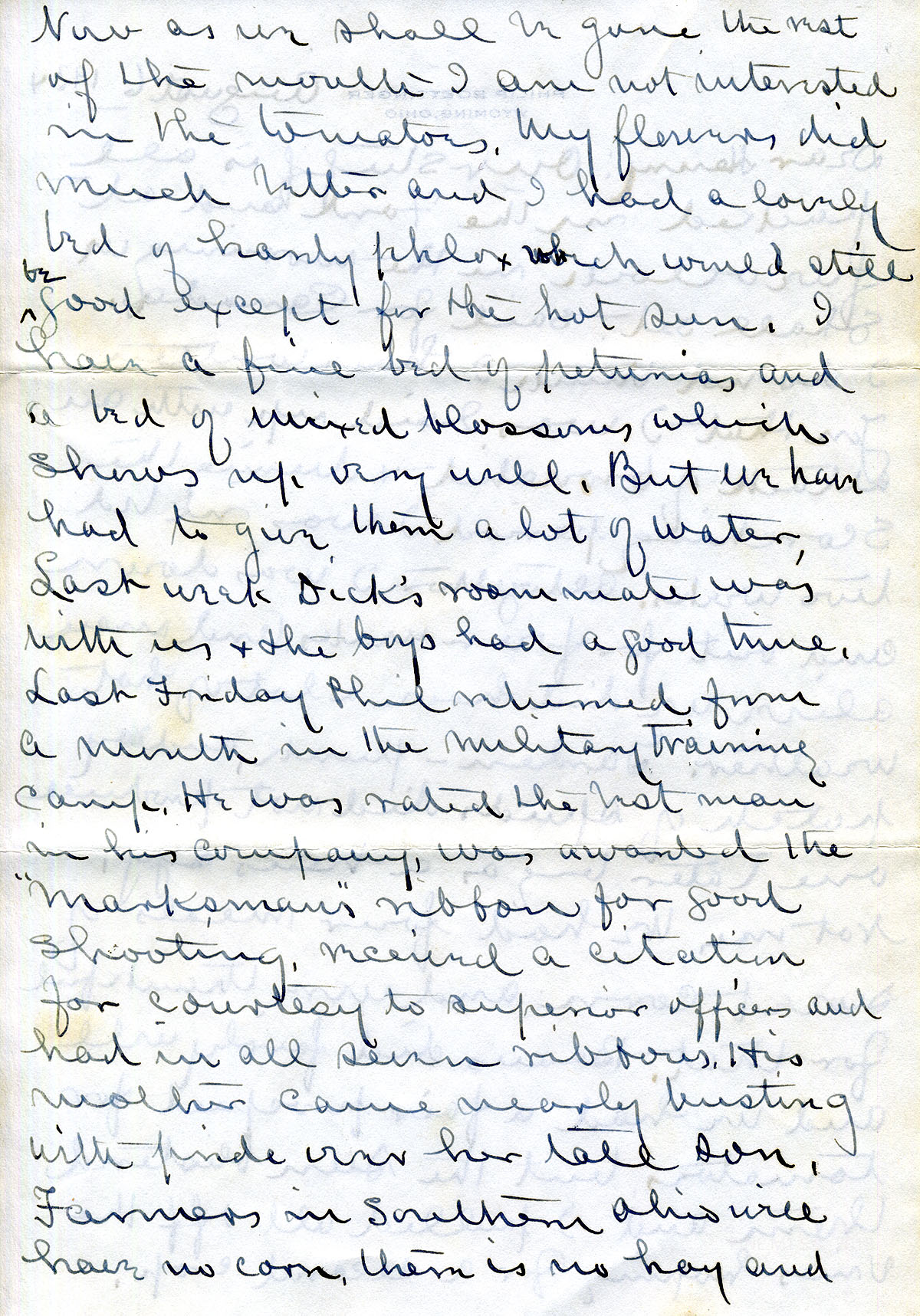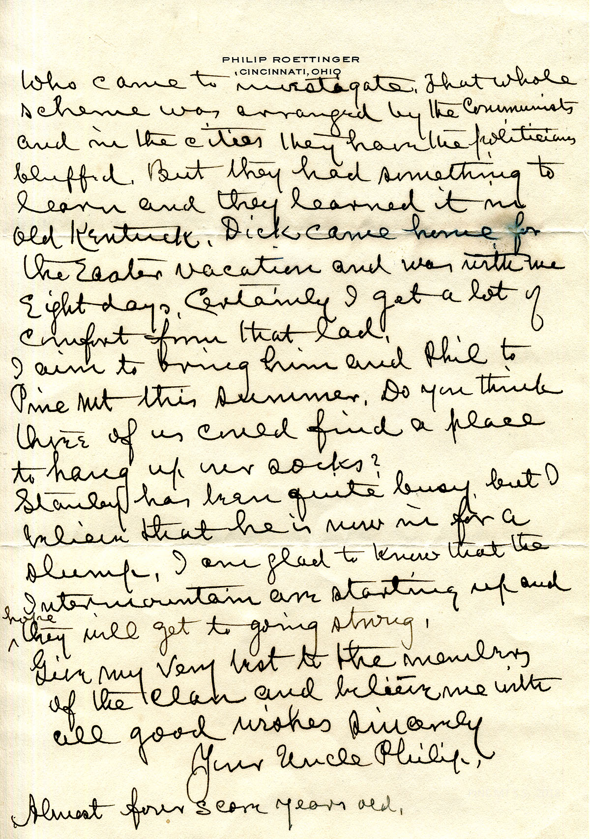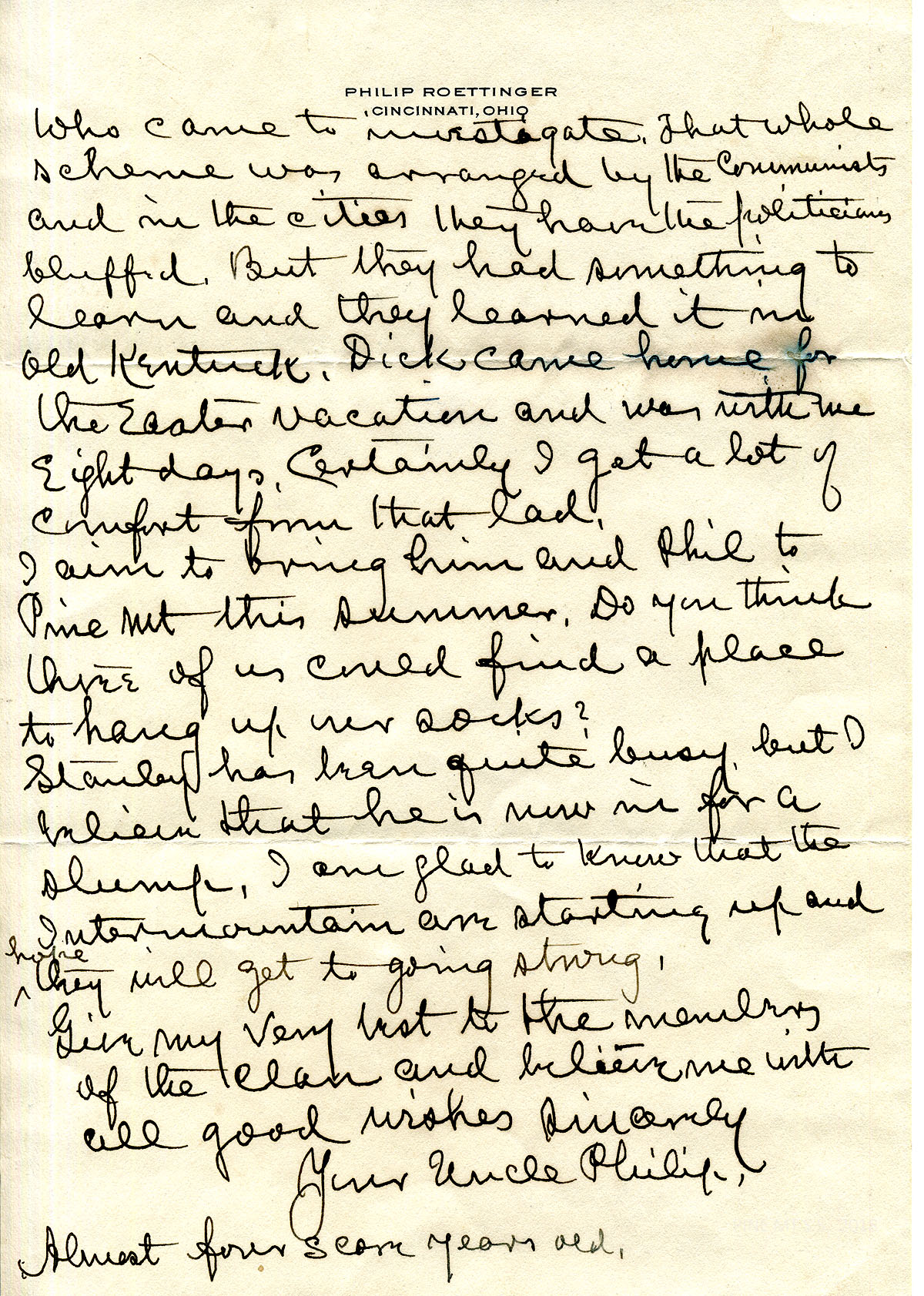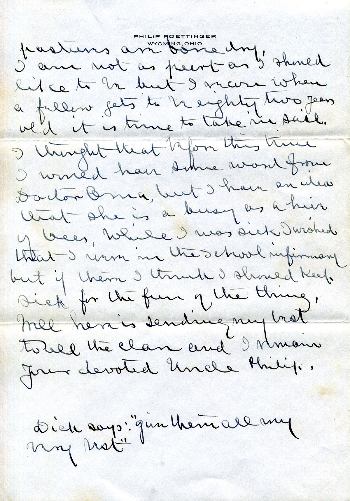 010-010b August 6, 1934. To Henry from “Uncle Philip” [Roettinger], [010] telling him about his recent bronchitis, plans to travel to Canada, the hot weather’s effect on his garden. Also shown: Envelope addressed to Mr. Henry C. Creech from Roettinger. [010a] He describes his sons’ activities, including Dick’s month in the military training camp. [010b] Mentions his age as 82; “While I was sick I wished that I were in the School infirmary…for the fun of the thing.”