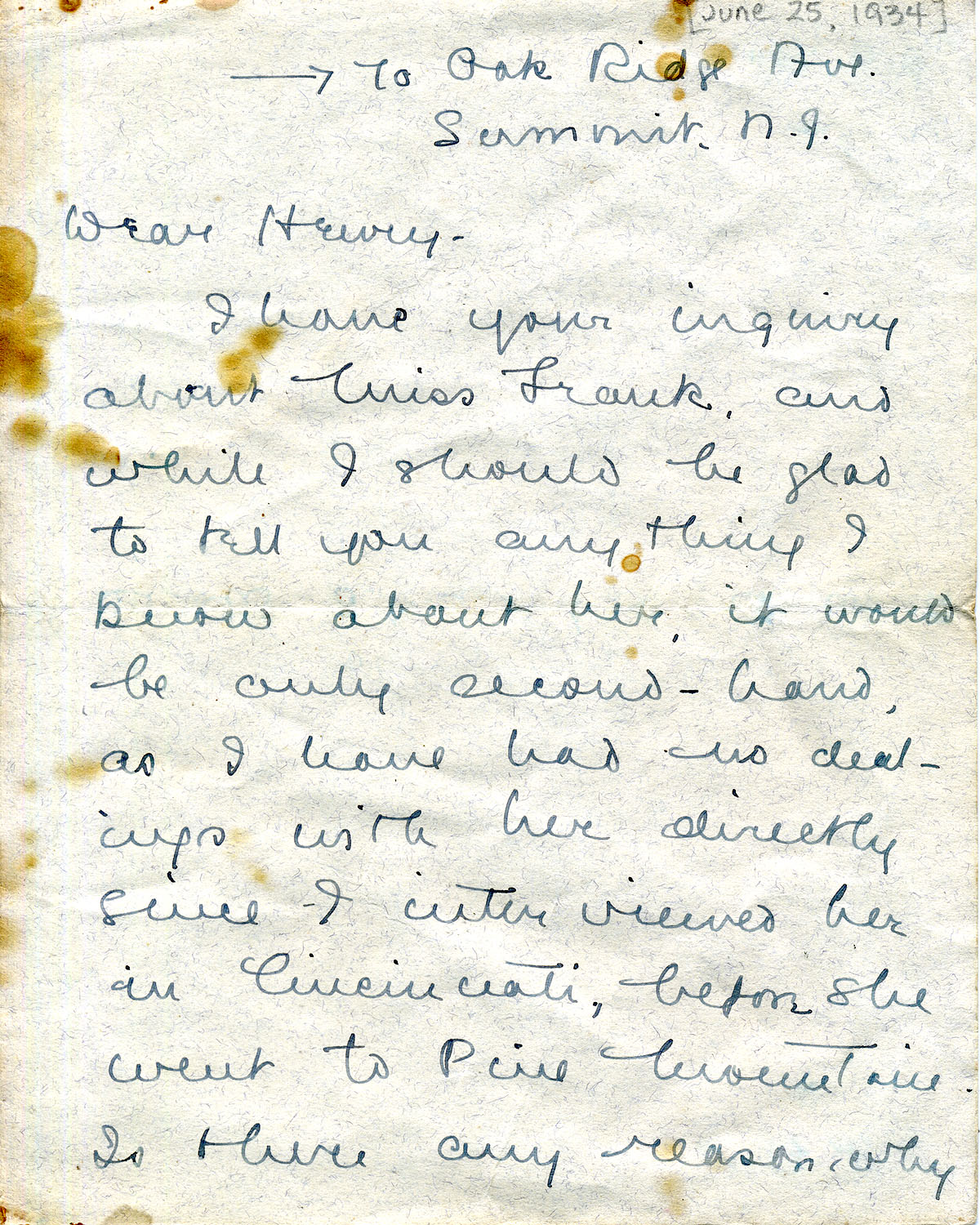 009-009b June 25, 1934. Three-page handwritten letter to Henry from Evelyn Wells in Summit, NJ. Responding to his inquiry about Miss Frank, she tells him she has no information since the time she interviewed Frank in Cincinnati. She advises that he ask Morris. She hopes to meet with “Anna” in Boston next fall; appreciates Delia’s letters; hopes to attend the fall board meeting.