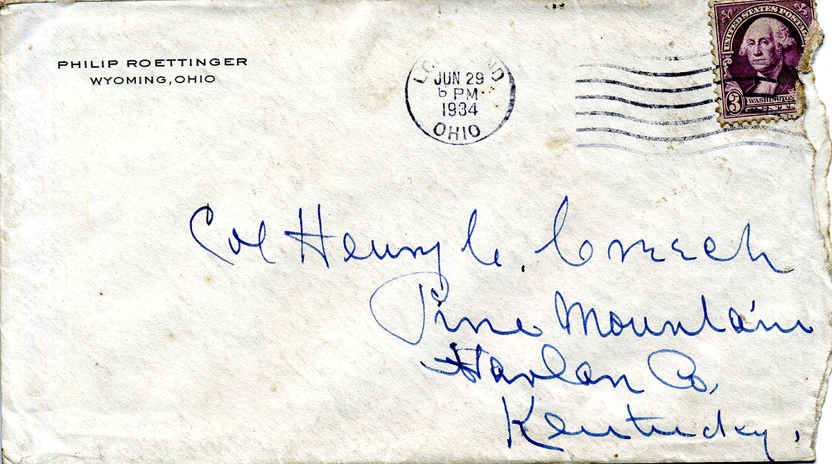 In these letters of Henry C. Creech, written during the years from 1930 to 1934, he struggles with the Progressive program of Pine Mountain Settlement School Director Glyn Morris. As Henry becomes increasingly angry with Morris he finds comfort in the advice of a good friend, Philip Roettinger, a conservative Cincinnati lawyer friend of Henry’s father, William Creech. “Uncle” William Creech donated much of the land for the Pine Mountain Settlement School.