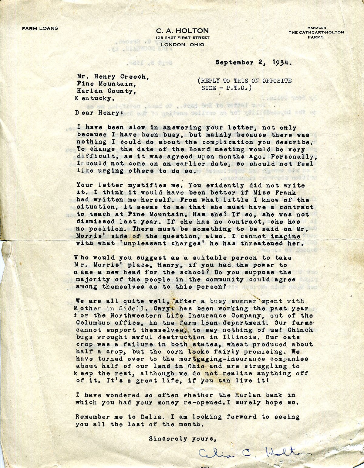014 September 2, 1934. To Henry from Celia C. Holton, Manager of The Cathcart-Holton Farms, London, OH. “(Reply to this on opposite side – P.T.O.)” She regrets that she cannot change the date of the board meeting. She has misgivings about Henry’s letter and wished that Miss Frank would have written her directly. She asks who Henry would suggest to replace Morris and whether the community could agree on the person. She gives updates on her family: her Mother, Caryl, the farm loan business, and struggles experienced by farms in Ohio.