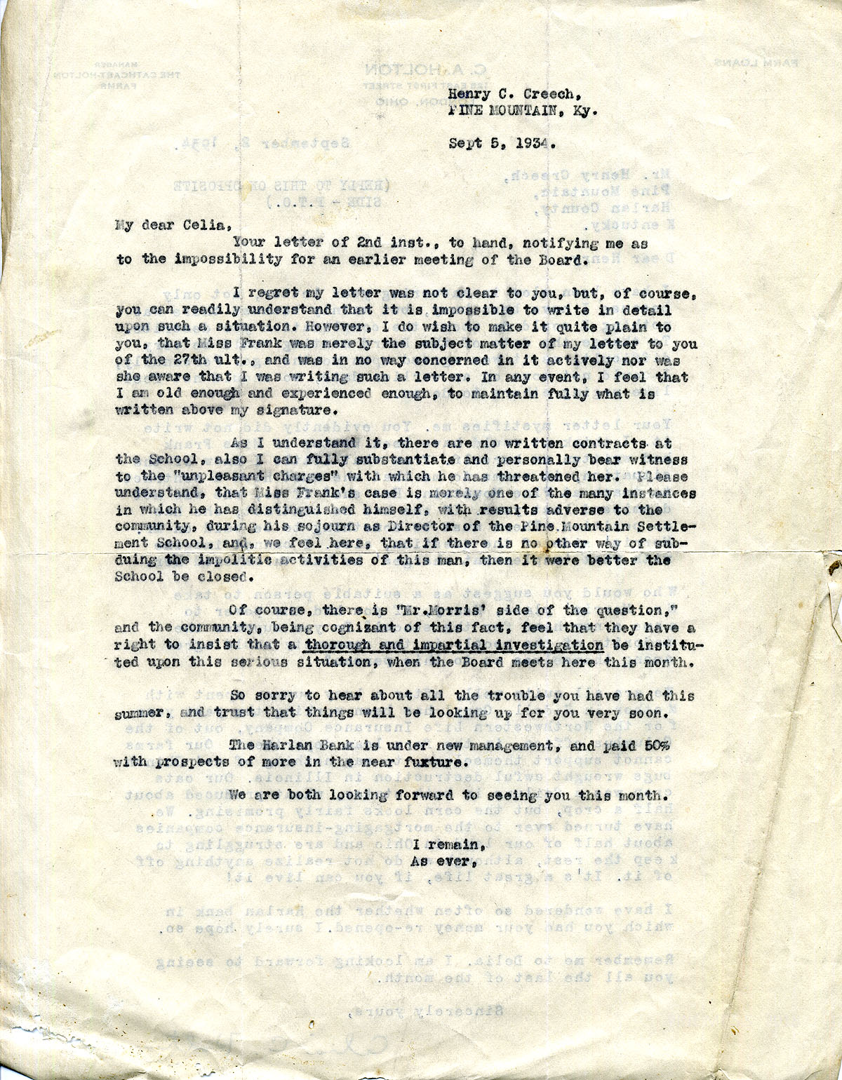 011-012 August 27, 1934. Carbon copy of a two-page letter to Celia Cathcart Holton from Henry C. Creech, asking her to move the board meeting to an earlier date. He details the conflicts occurring as a result of Morris’s firing of Miss Emily Frank, PMSS Principal. He expresses his doubt that Morris acted justly and questions whether Morris is actually carrying on PMSS’s mission as expressed by William Creech. Therefore, an early board meeting is needed to work out these issues before the school year begins.
