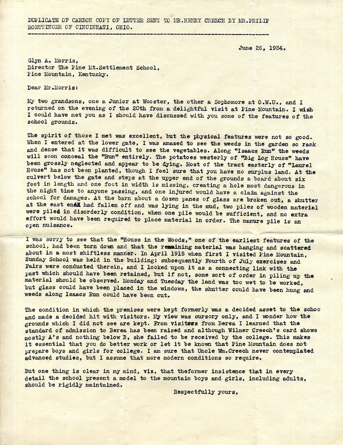 016 June 26, 1934. To Morris from [unsigned, apparently Roettinger]. “Duplicate of carbon copy of letter sent to Mr. Henry Creech by Mr. Philip Roettinger of Cincinnati, Ohio.” Having just returned from a “delightful” visit to PMSS with his grandsons, he wished to discuss with Morris concerning the school grounds. “The spirit of those I met was excellent, but the physical features were not so good.” He describes weeds, neglected gardens, a missing board at the culvert, broken barn windows, disorderly piles of wood, etc. He regrets that the “House in the Woods” was torn down and shares his 1915 memories of the structure. He points out that Berea College, which raised its standards of admission, did not accept Wilmer Creech even though her grades were A’s and B’s.
