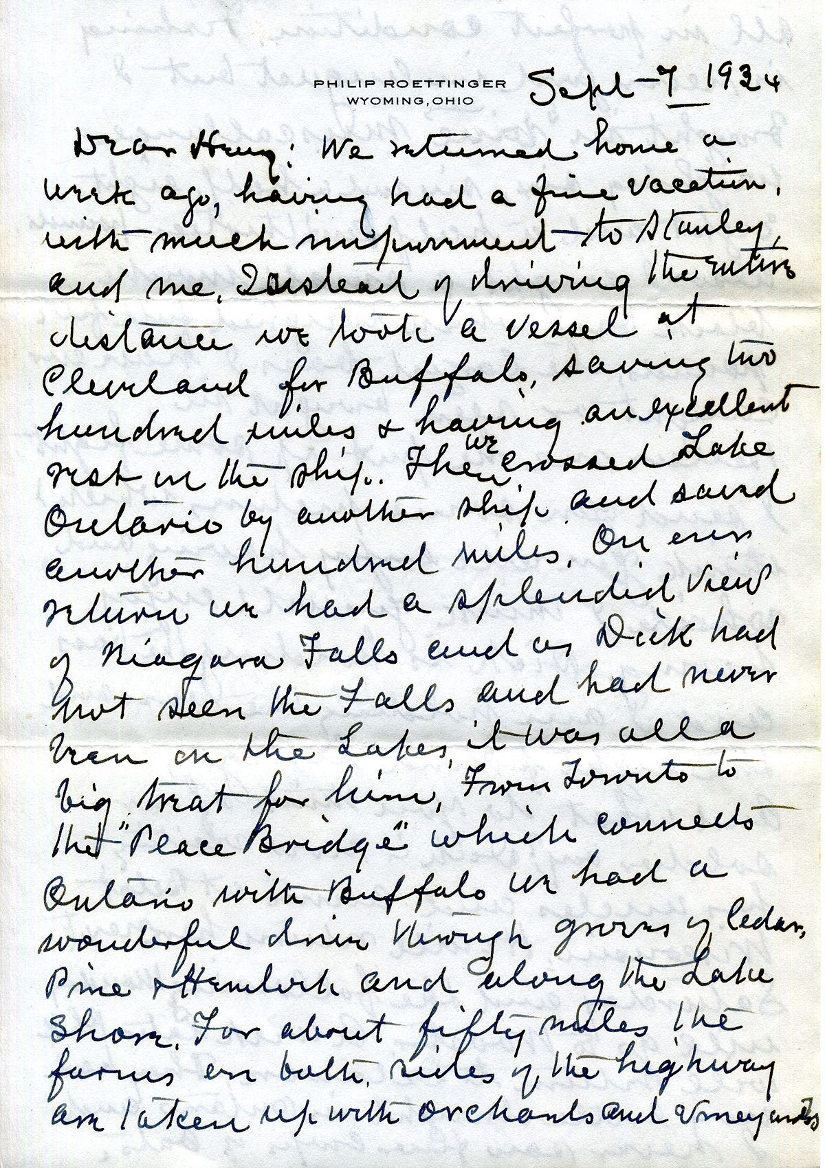017-017b September 7, 1934. Three-page handwritten letter to Henry from “Your Uncle Philip” [Roettinger], [017] who describes his vacation travels with Stanley, including sailing on Lakes Erie and Ontario. [017a] He will send photos of him and Dick fishing; describes his sons’ activities. [017b] He asks about “Dr. Oma [Creech].”