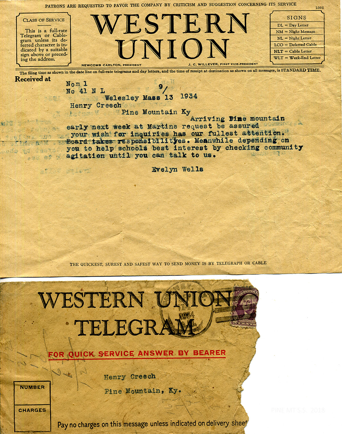 019 September 13, 1934. Western Union telegram to Henry Creech from Evelyn Wells, Wellesley, MA, who will be arriving at PMSS early next week, and assures him that “your wish for inquiries has our fullest attention… Meanwhile depending on you to help school’s best interest by checking community agitation until you can talk to us.” Also shown: Western Union Telegram envelope addressed to Henry Creech.