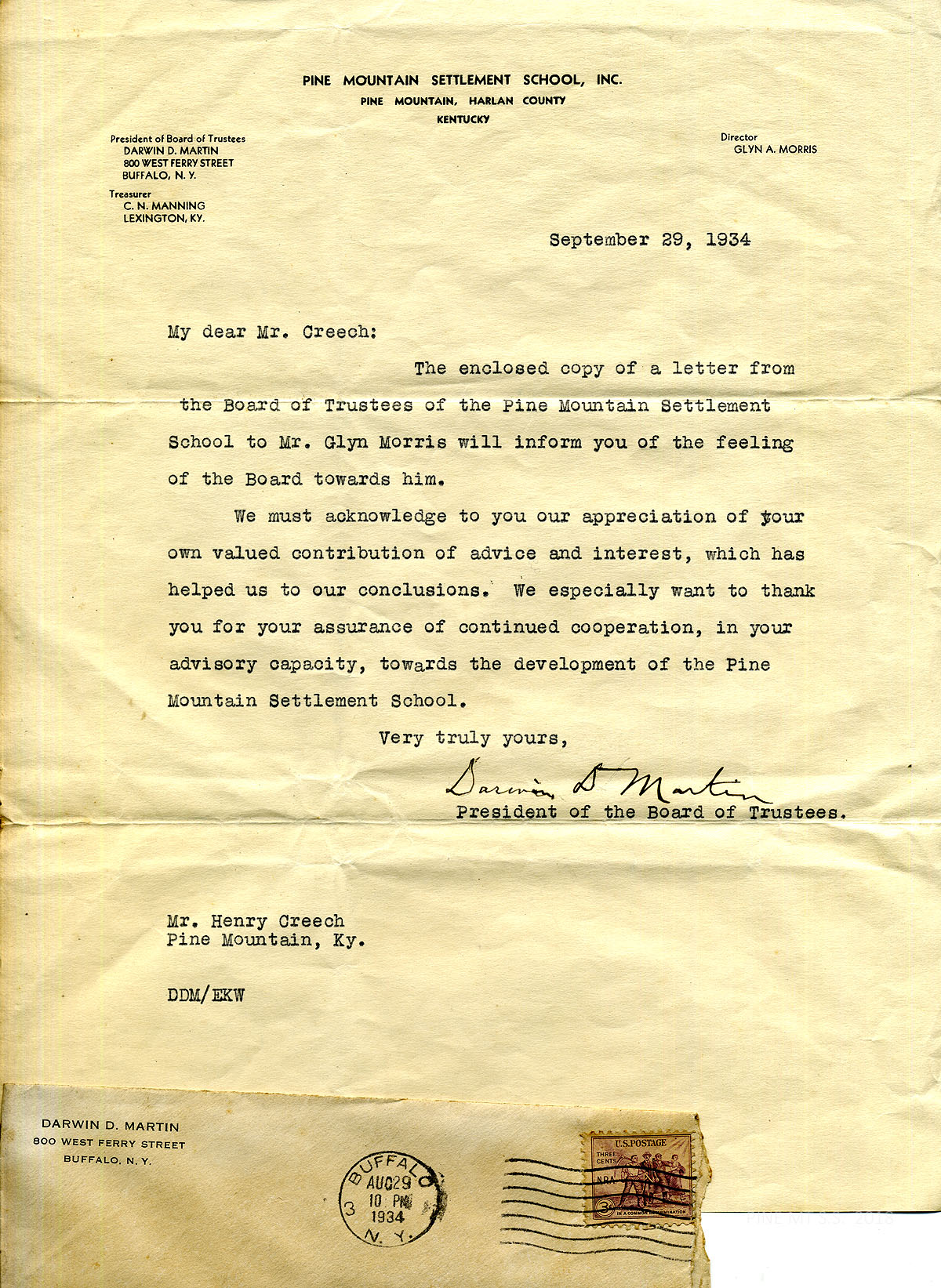 020 September 29, 1934. To Henry from Darwin D. Martin, President of the Board of Trustees, on PMSS letterhead, enclosing a copy of a letter from the Board to Morris. He acknowledges Henry Creech’s “advice and interest, which has helped us to our conclusions” and thanks him for his “assurance of continued cooperation, in your advisory capacity towards the development of the Pine Mountain Settlement School.” Also shown: Envelope to [truncated] from Darwin D. Martin, Buffalo, NY.