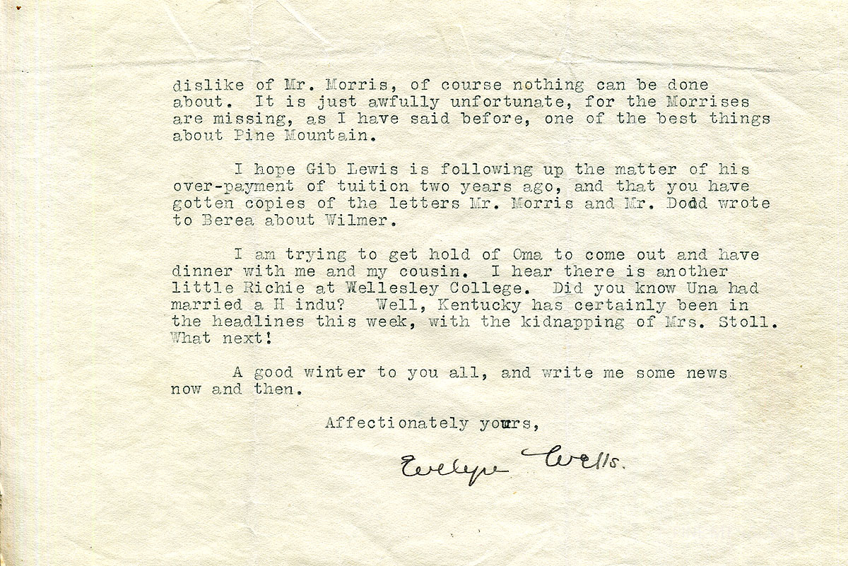 021-021a October 17, 1934. Two-page letter to Henry and Delia from Evelyn Wells, Wellesley, MA, [021] who describes her visit at PMSS, mentioning Mr. [Leon] Deschamps’ building, May’s coverlet, and Luigi Zande, his children (Berto and Elena), and wife Caroline, She hopes Henry is “feeling a little happier over the school situation” and explains how the Board reached its decision to support Morris. She lists those involved in the decision and their expertise: Miss Pettit, Mr. [Charles N.] Manning, Mrs. Holton, Dorothy Bolles, and herself. [021a] She mentions Gib Lewis, Oma, Una, and letters to Berea from Morris and [Arthur] Dodd about Wilmer.