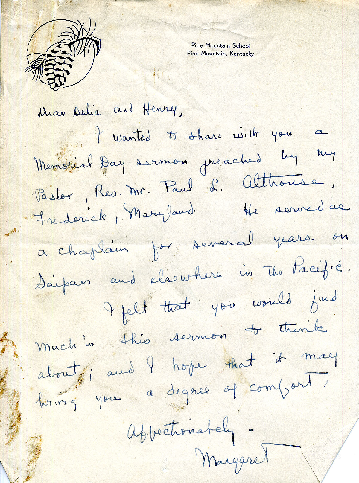 022 N.D. Handwritten letter on Pine Mountain stationery to Delia and Henry from “Margaret,” who encloses a Memorial Day sermon presented by her pastor in Frederick, MD, hoping his words may bring them comfort.