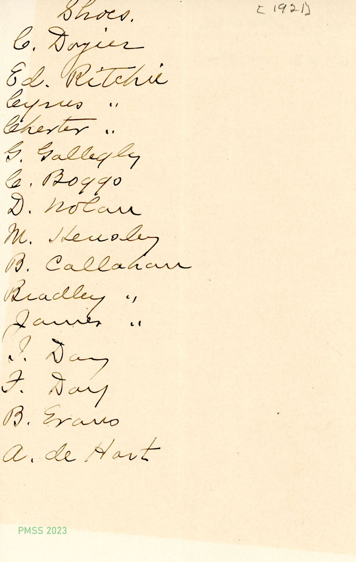 025-025a [No date; 025 handwritten list of names under the headings “Shoes” and 025a “Boys’ House Shoe list.”