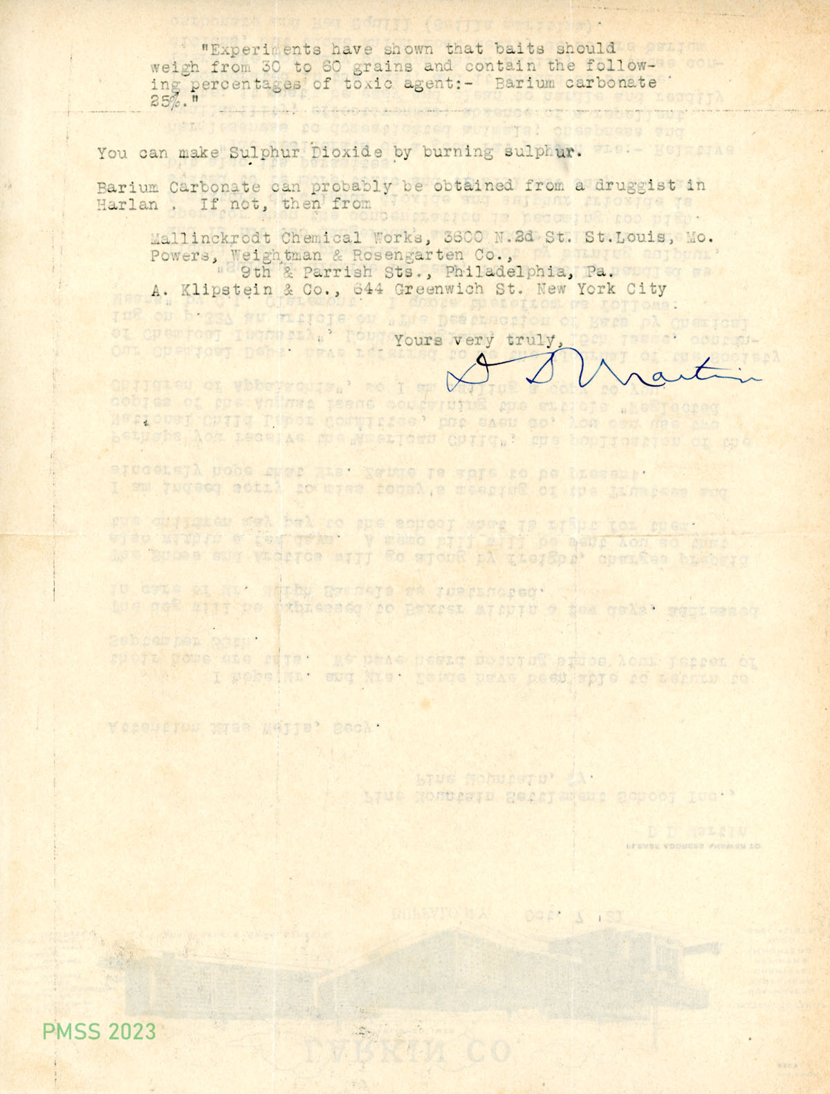 023 August 25, 1921. To Martin from Zande, asking if he can recommend “a rat exterminator that is used by firms in cities….”