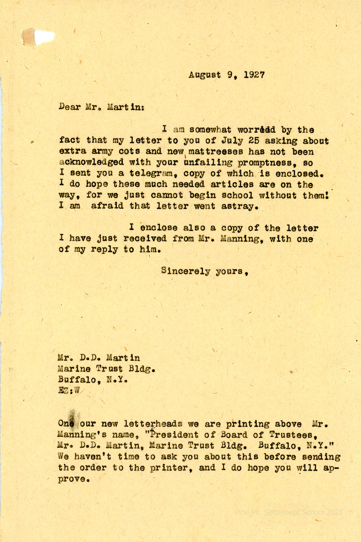 052 August 9. EZ (Zande) to Martin, enclosing a copy of a telegram to Martin, asking about extra army cots and new mattresses, “much needed articles…[W]e just cannot begin school without them!” Zande also encloses letters between her and Mr. [C.N.] Manning.