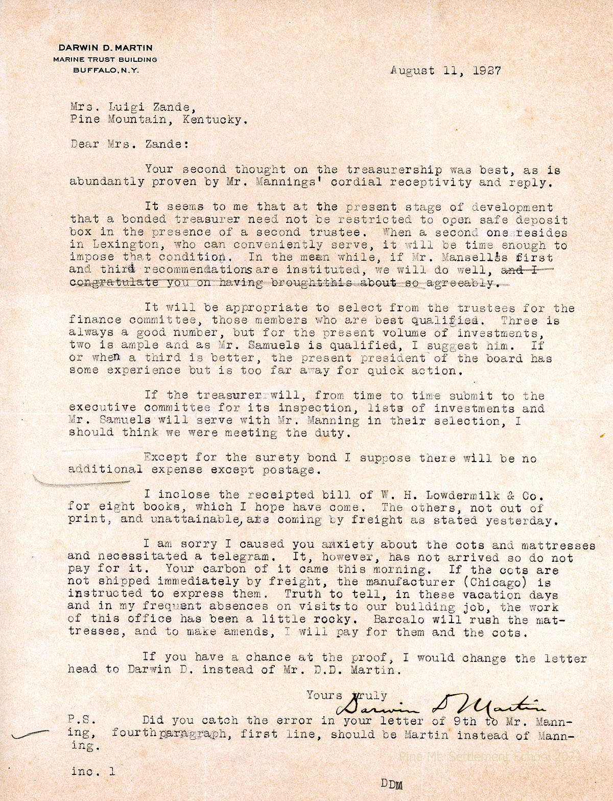 055 August 11. Martin to Mrs. Zande, assuring her that she made the right decision to write to C.N. Manning, “as is abundantly proven by Mr. Mannings’ cordial receptivity and reply.” Advises on which of Mansell’s recommendations to institute now and later; advises selecting qualified members for the finance committee, suggesting Mr. Samuels; that the treasurer submits lists of investments to the executive committee on a timely basis. Encloses a “receipted bill of W.H. Lowdermilk & Co. for eight books….” Updates Zande on shipment of cots and mattresses. To make amends for the delayed delivery, Martin will pay for both.