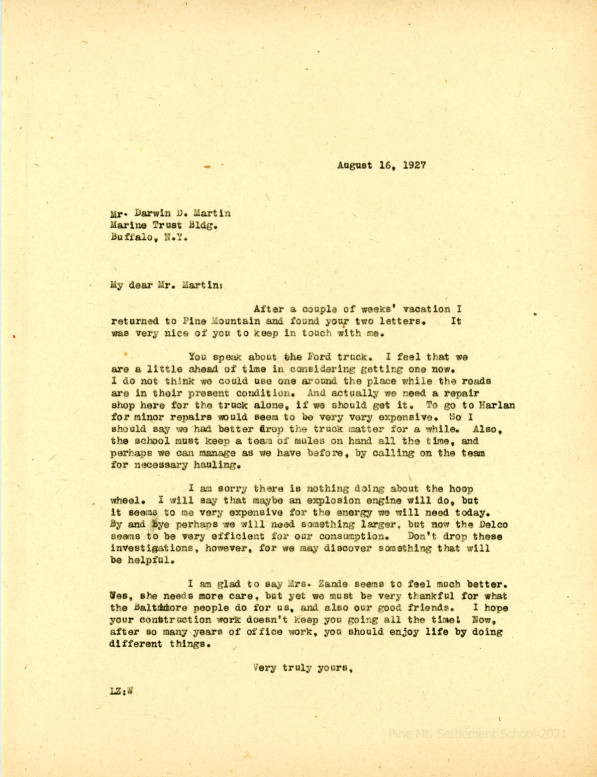 058 August 16. LZ (Luigi Zande) to Martin. Luigi does not think it is a good time to have the Ford truck and gives the reasons why. Tells him that the Delco is sufficient for the School’s needs and there is no need for the “hoop wheel.” Comments on Mrs. Zande’s health.