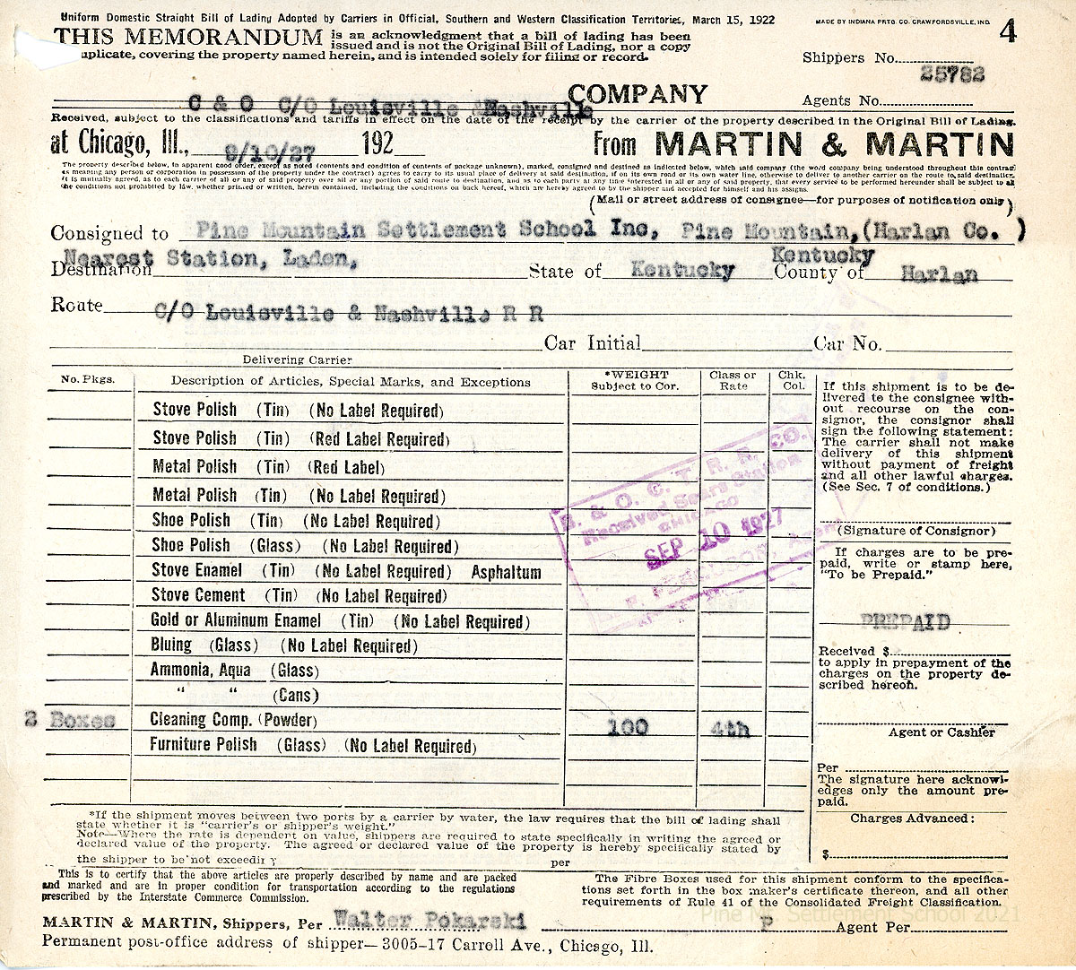 066 September 10. An acknowledgment “that a bill of lading has been issued” from C & O Louisville & Nashville (Railroad) Company at Chicago, Ill, on 9/10/27 from Martin & Martin to Pine Mountain Settlement School, Inc. Articles include polishes, enamels, bluing, ammonia, and cleaning powder, totaling 100 lbs.