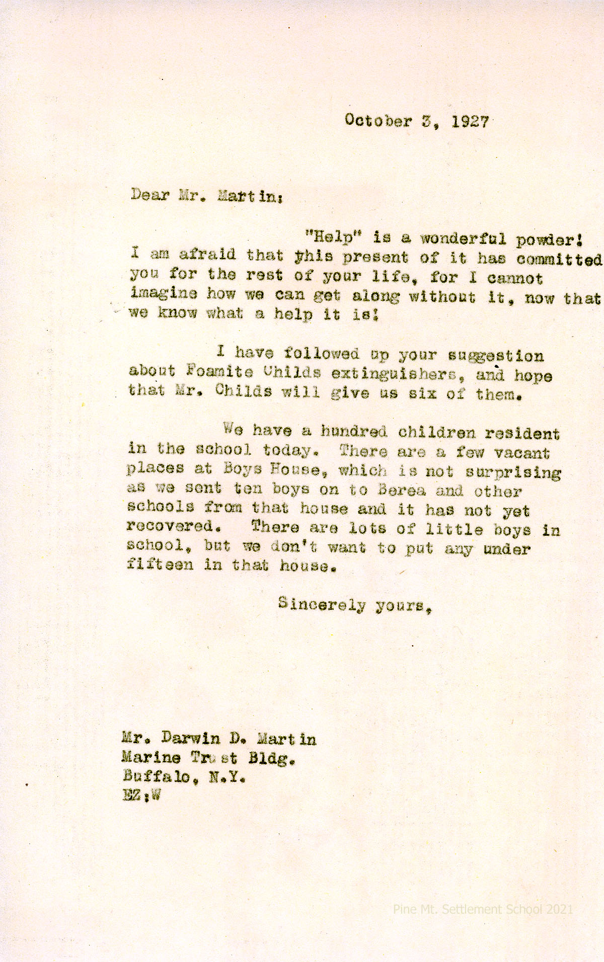 Martin is happy to supply PMSS with “Help” and compares the hardness of the water in Buffalo, his new country home on Lake Erie, and in Kentucky. He ponders how useful a Permutit water softener or collection of rainwater would benefit PMSS; suggests that an alternative to Foamite Childs fire extinguisher could be La France Fire Engine Co., Elmira, NY. Dr. Severance frequently asks if Mrs. Parke is at PMSS.