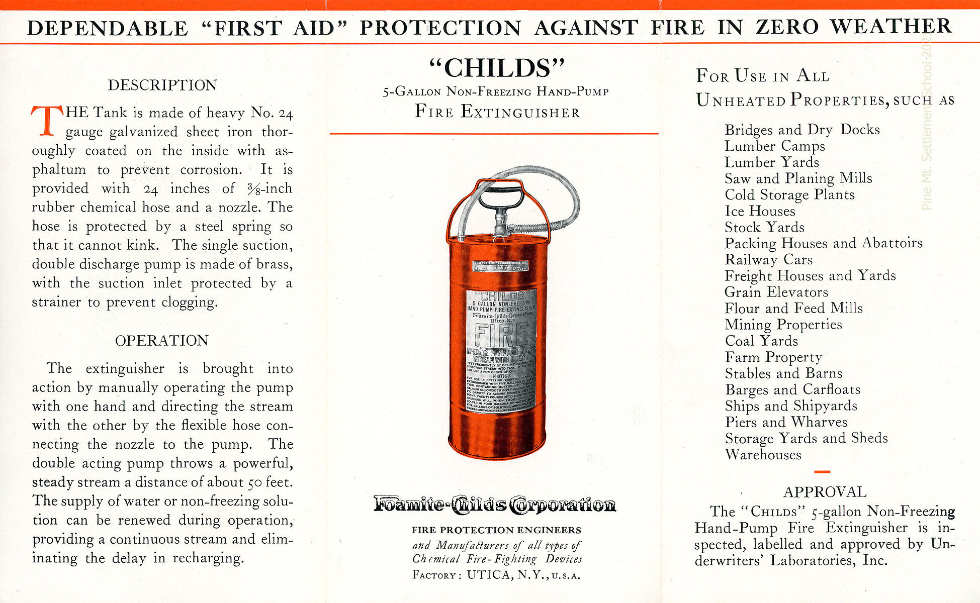 072 Specification sheet for “Childs” Fire Extinguisher, 5-gallon, non-freezing, hand-pump from Foamite-Childs Corporation, Utica, NY.