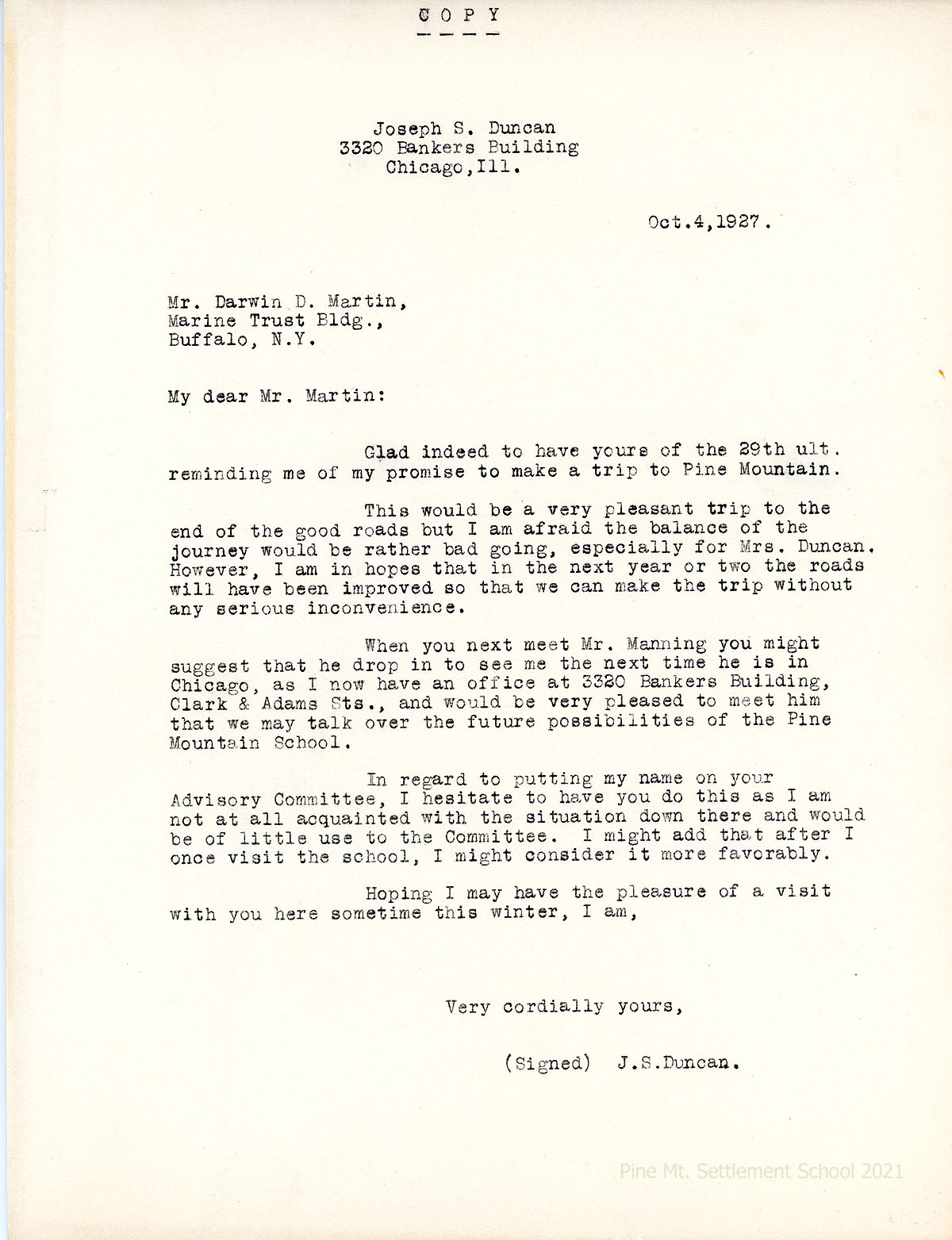 076 October 4. Copy of a letter from Joseph S. Duncan, Chicago, IL, to Martin. Explains that he cannot visit PMSS until roads are improved; asks that Mr. Manning visit him in Chicago to talk about PMSS’s future; declines to be added to the Advisory Committee, but may do so after he learns more about the School.