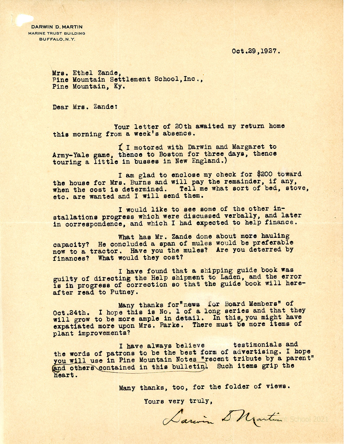 081 October 29. Martin to Mrs. Zande, enclosing a $200 check toward the house for Mrs. [Martha] Burns and asked what equipment he can send; expects to help finance other installations. Asks how Mr. Zande is increasing “hauling capacity,” such as mules. A guide book had erroneously listed Laden as the shipping destination for PMSS; he will correct that to Putney. He thanks Zande for the “news for Board Members” and hope it will become a long series. Suggests using testimonials of patrons in the School’s “Notes” to advertise the School.