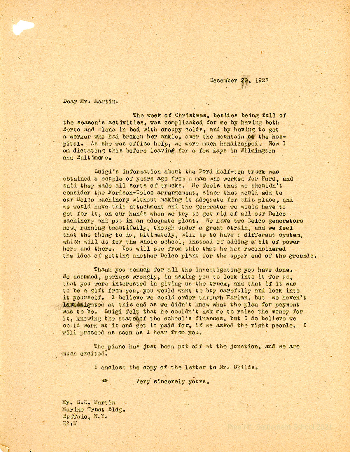 102 December 30. EZ (Zande) to Martin. She tells about her children, Berto and Elena, “in bed with croupy colds,” and her office help who broke her ankle. She reports that Luigi Zande feels that “we shouldn’t consider the Fordson-Delco arrangement” because the school will be changing to a different system in the future that will be adequate for the whole School. Therefore, Luigi will not be setting up a second Delco unit, as he was originally considering.