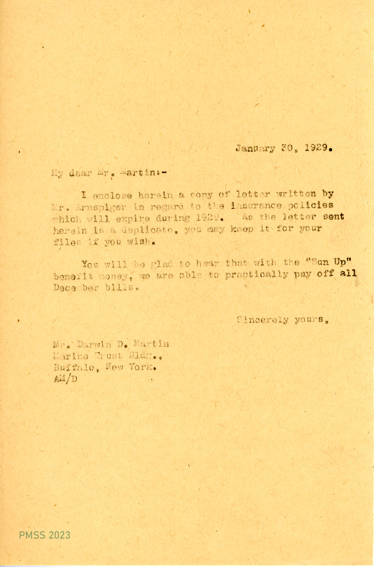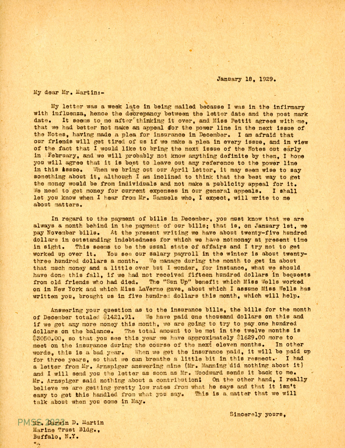 002 January 18, 1929. To Darwin D. Martin from [unsigned, apparently Angela Melville], with ideas on what fundraising pleas to make, if any, in the upcoming issues of “Notes.” The writer is waiting for advice from Mr. Samuels. PMSS is “always a month behind in the payment of our bills….” The writer describes the School’s expenses, income from bequests and the “Sun Up” benefit, and the School’s efforts to pay the insurance bills. The writer mentions a letter from Mr. Arnspiger about the lower rates for PMSS.
