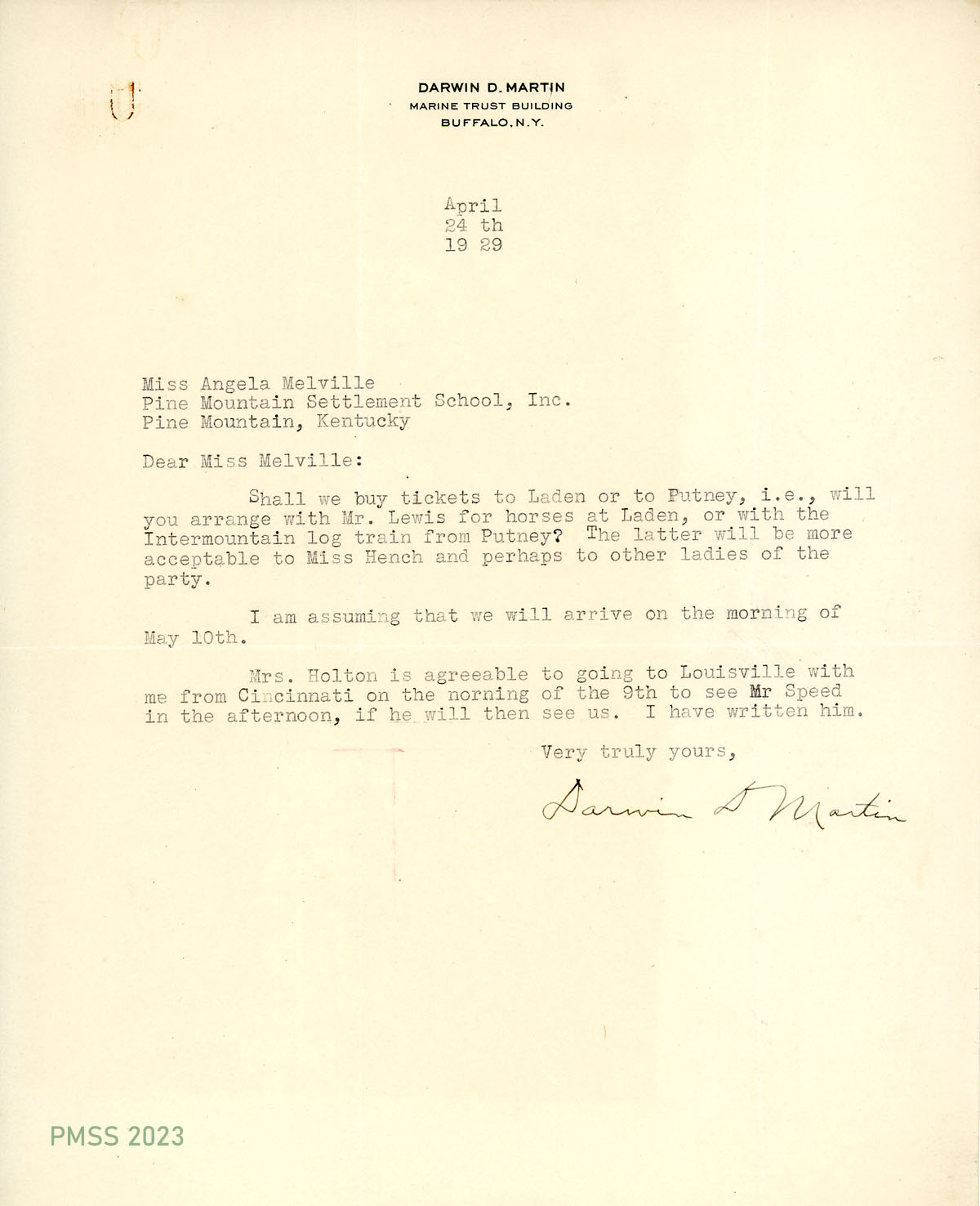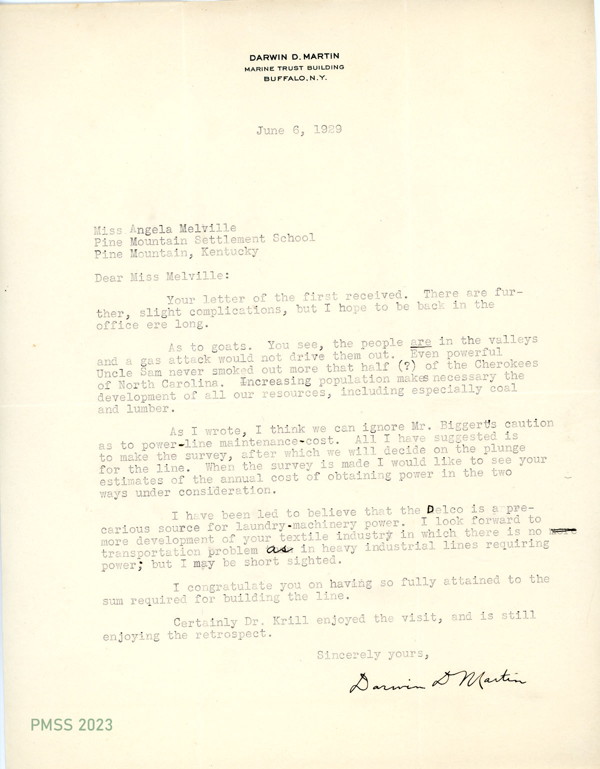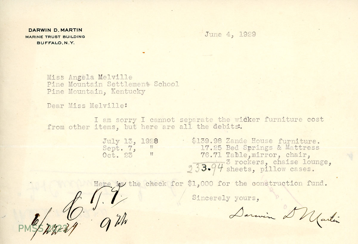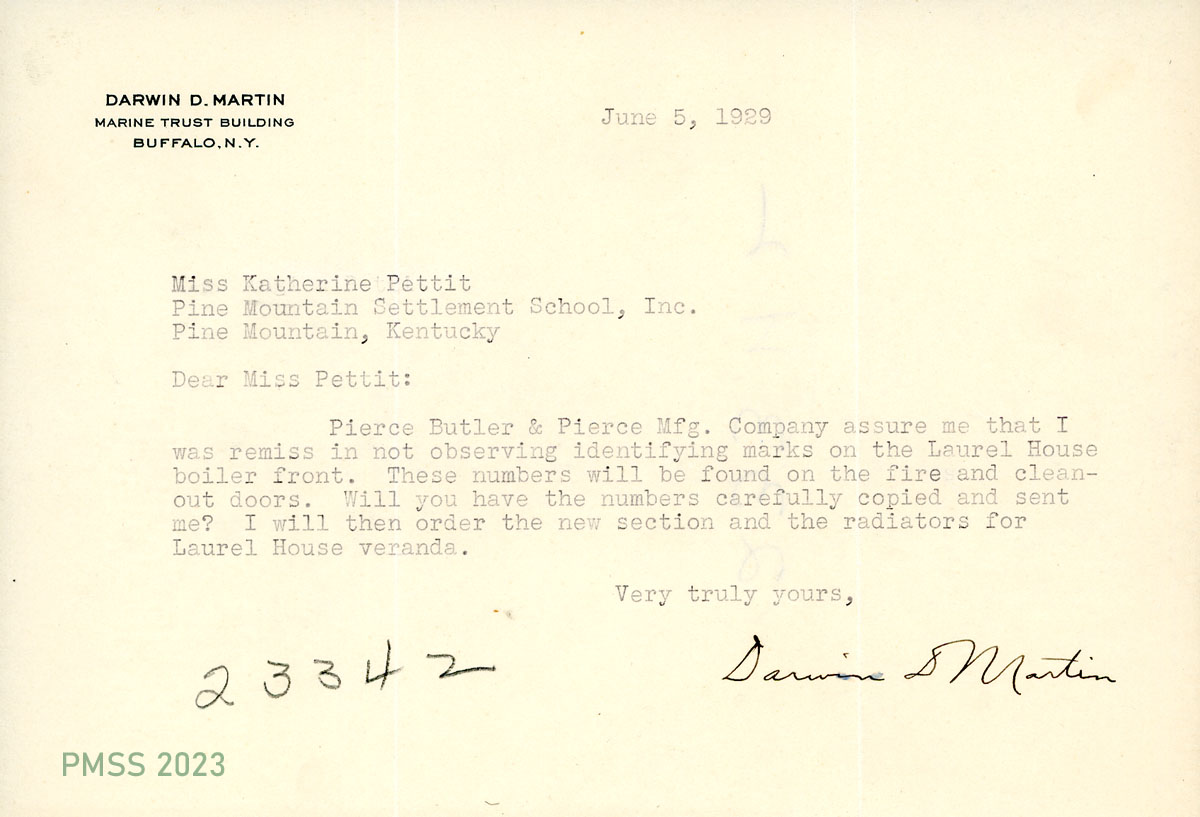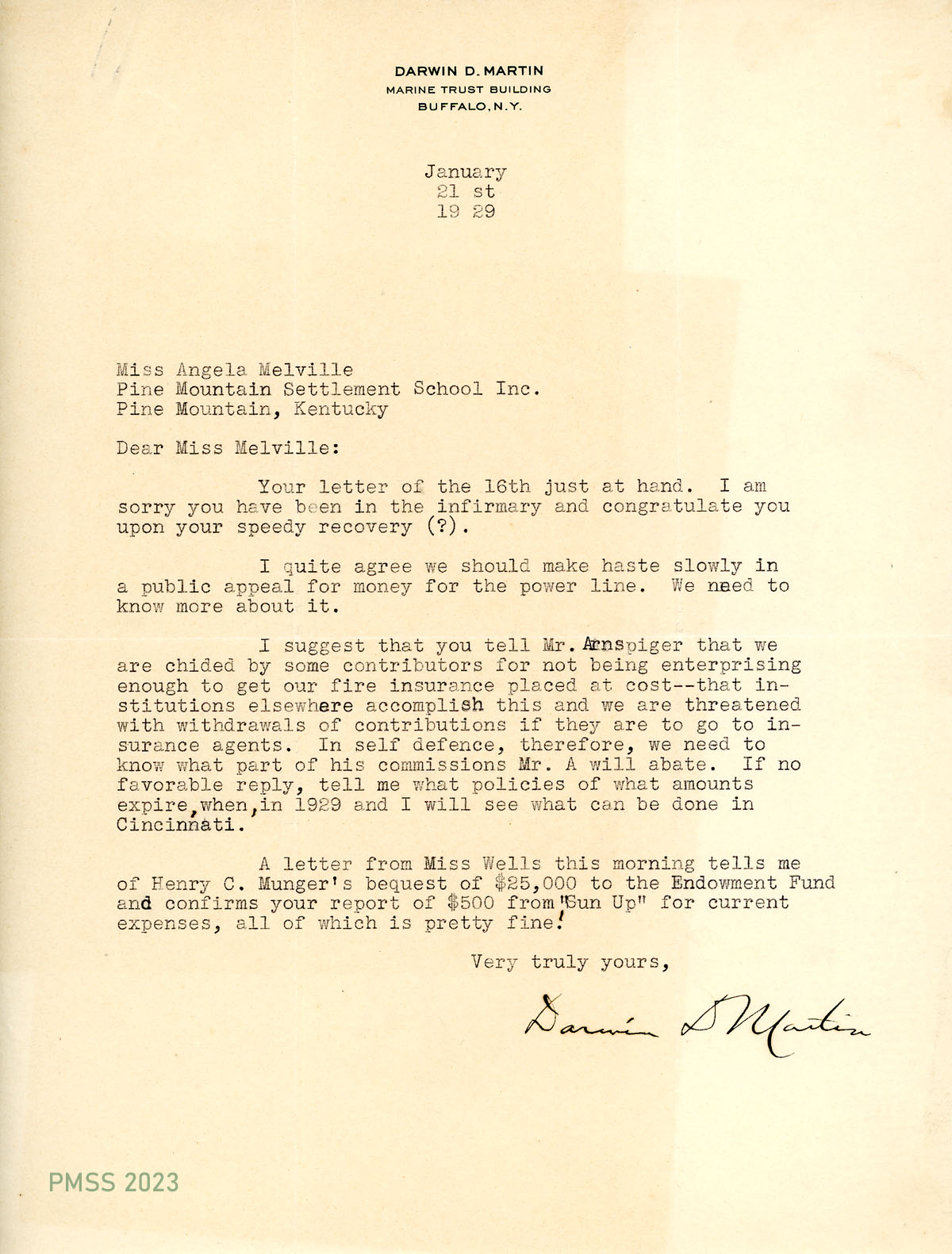 DARWIN D. MARTIN 1929 CORRESPONDENCE provides images and summaries of the correspondence of Darwin D. Martin, to and from Pine Mountain Settlement School staff. A member of the Board of Trustees at Pine Mountain Settlement School, 1920-1933, Martin was a generous contributor to and consultant for the School. He served for many years as the Board President. His knowledge and his wealth were fundamental to the success of the School in its earliest years of development. An executive of the Larkin Co. in Buffalo, New York, Martin was very generous with his gifts to the School.
