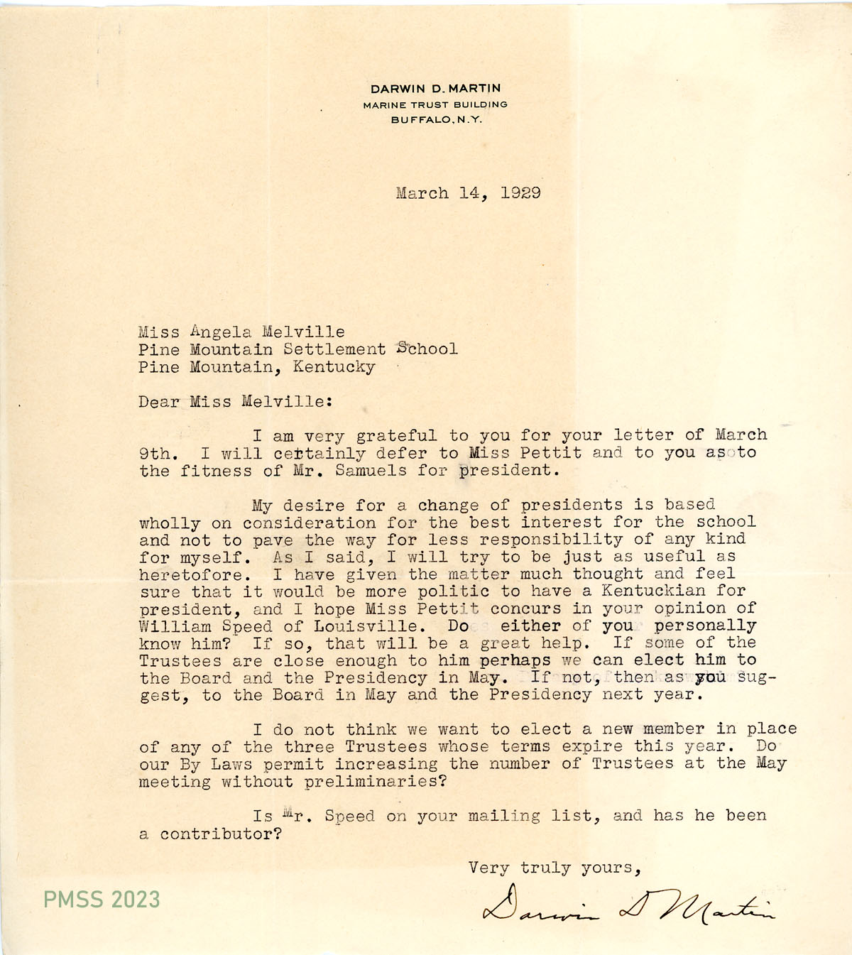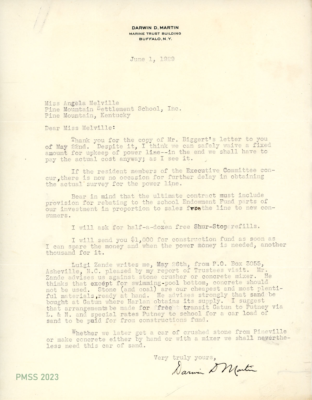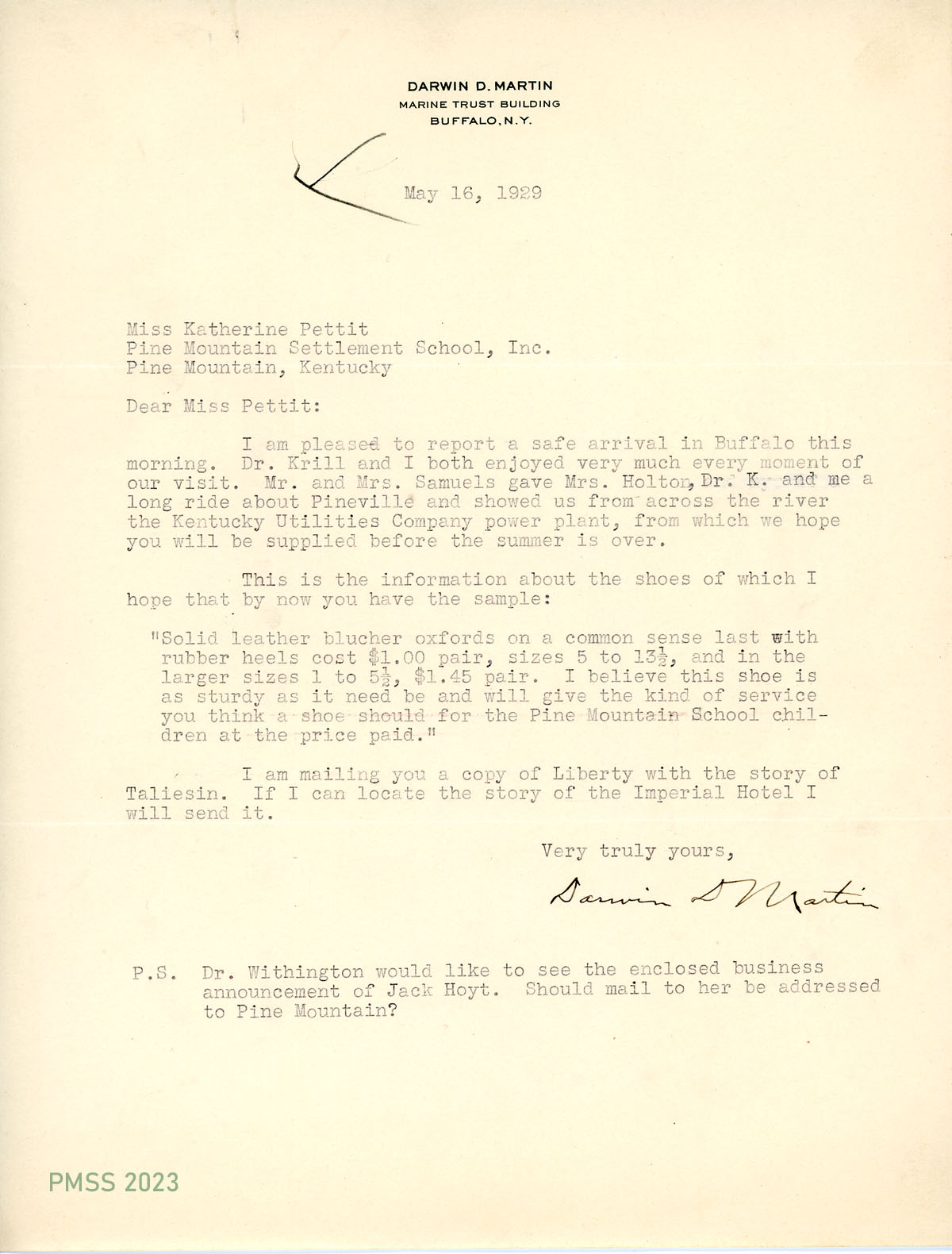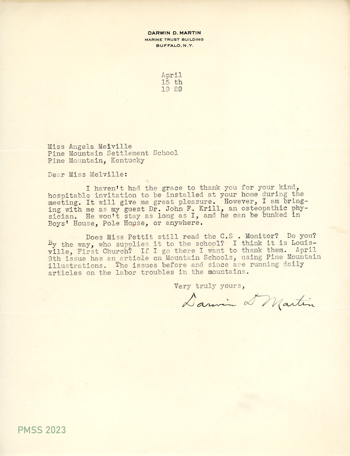 DARWIN D. MARTIN 1929 CORRESPONDENCE provides images and summaries of the correspondence of Darwin D. Martin, to and from Pine Mountain Settlement School staff. A member of the Board of Trustees at Pine Mountain Settlement School, 1920-1933, Martin was a generous contributor to and consultant for the School. He served for many years as the Board President. His knowledge and his wealth were fundamental to the success of the School in its earliest years of development. An executive of the Larkin Co. in Buffalo, New York, Martin was very generous with his gifts to the School.