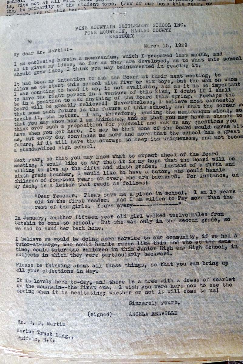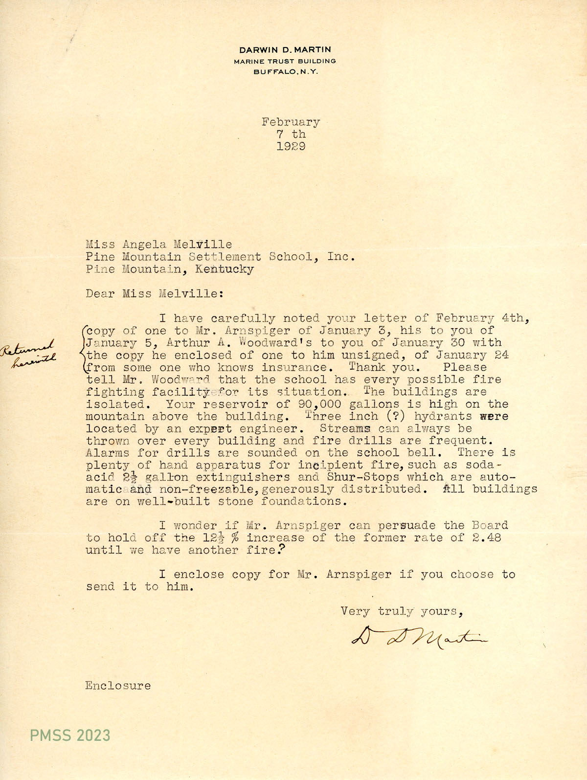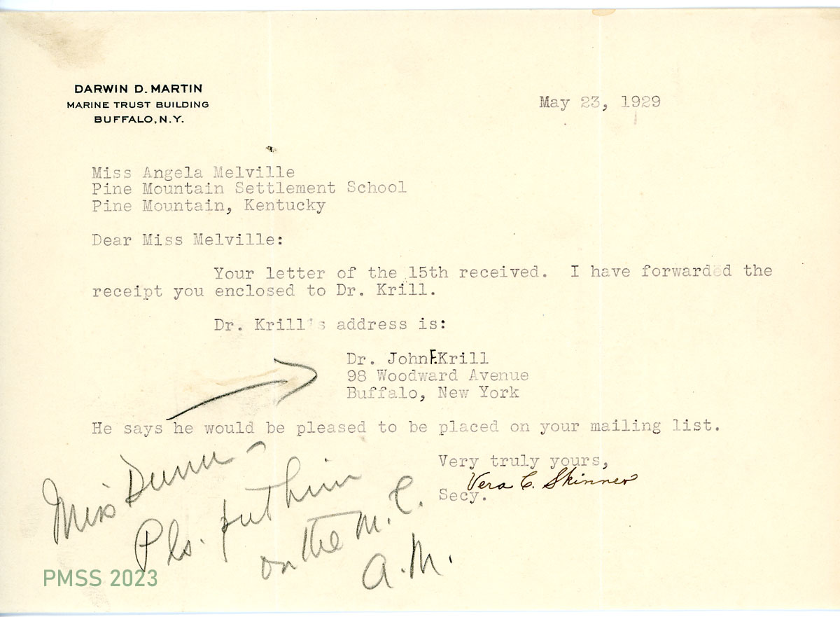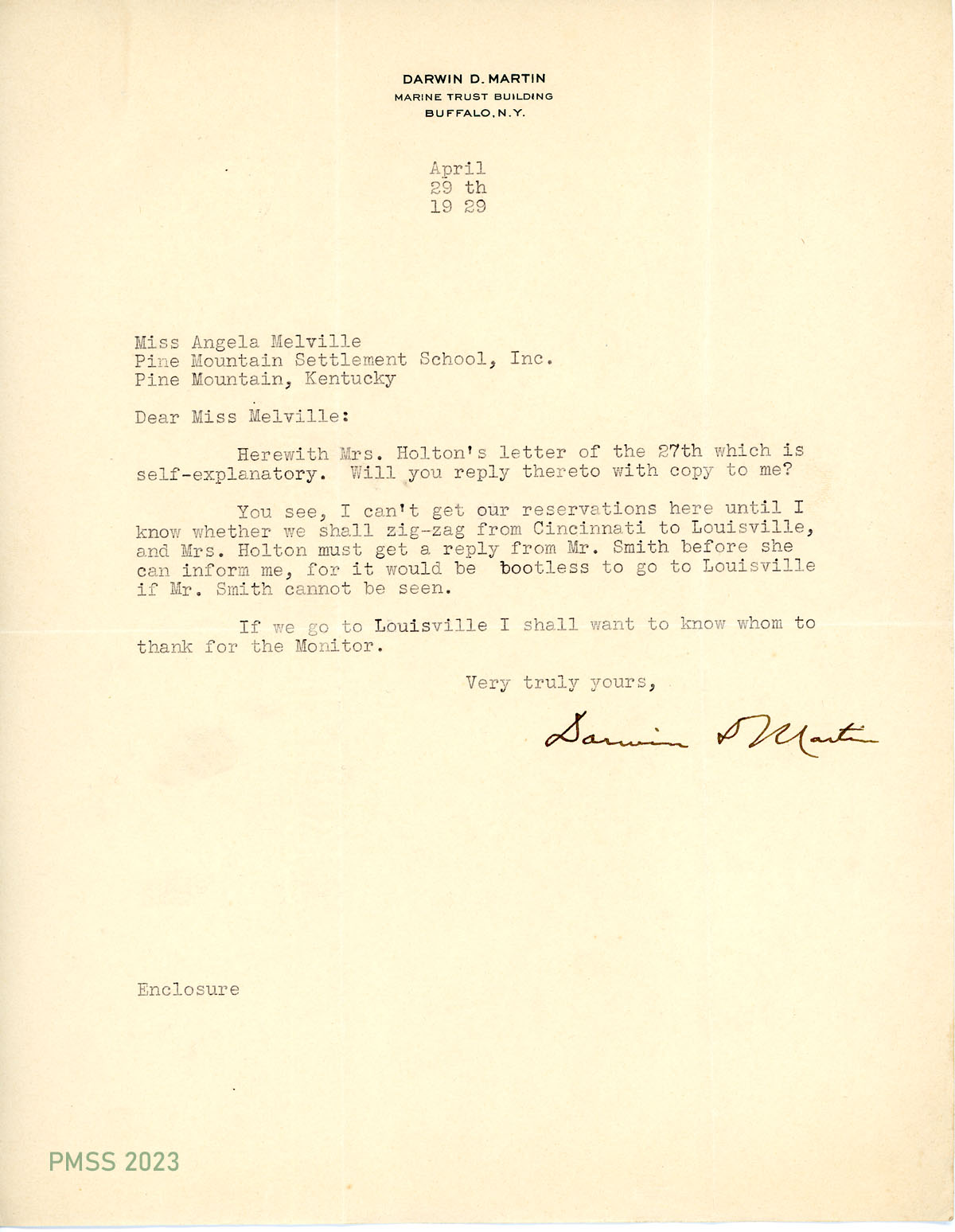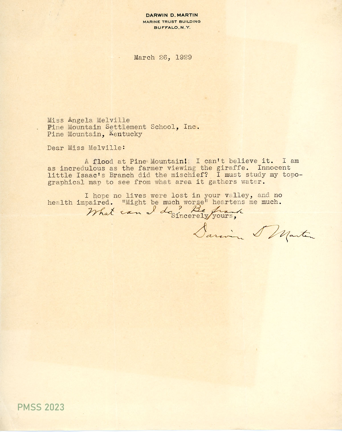 DARWIN D. MARTIN 1929 CORRESPONDENCE provides images and summaries of the correspondence of Darwin D. Martin, to and from Pine Mountain Settlement School staff. A member of the Board of Trustees at Pine Mountain Settlement School, 1920-1933, Martin was a generous contributor to and consultant for the School. He served for many years as the Board President. His knowledge and his wealth were fundamental to the success of the School in its earliest years of development. An executive of the Larkin Co. in Buffalo, New York, Martin was very generous with his gifts to the School.