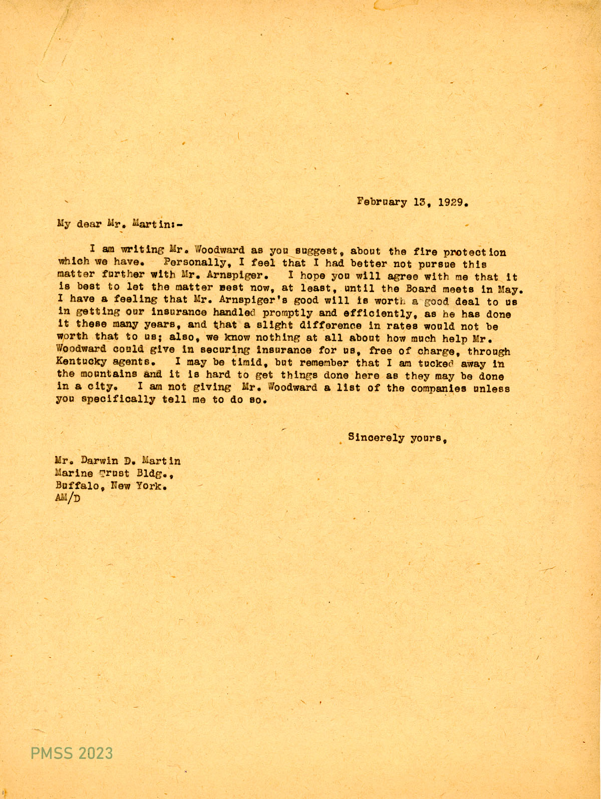 007 February 13, 1929. To Martin from AM [Melville], who feels that Arnspiger should not be approached at this time: “I have a feeling that Mr. Arnspiger’s good will is worth a good deal to us in getting our insurance handled promptly and efficiently, as he has done it these many years, and that a slight difference in rates would not be worth that to us ….”
