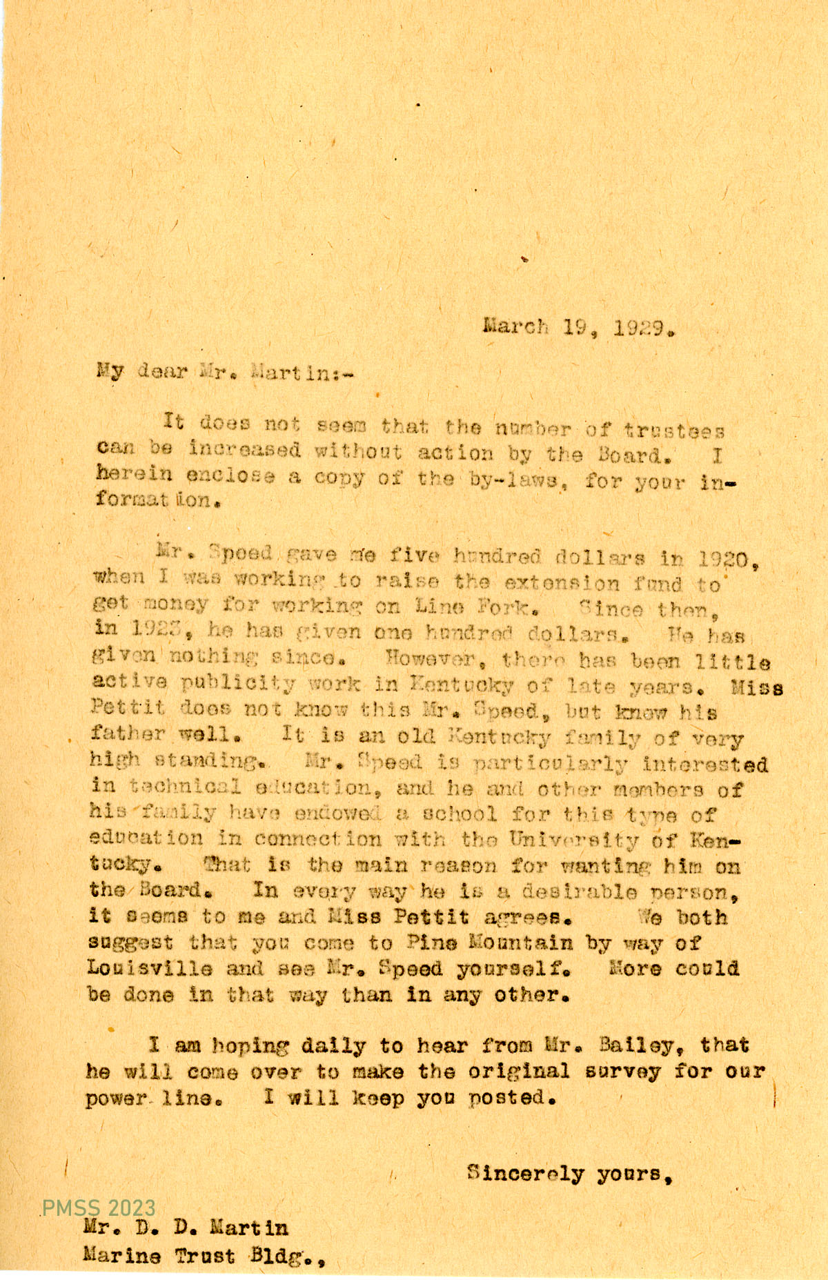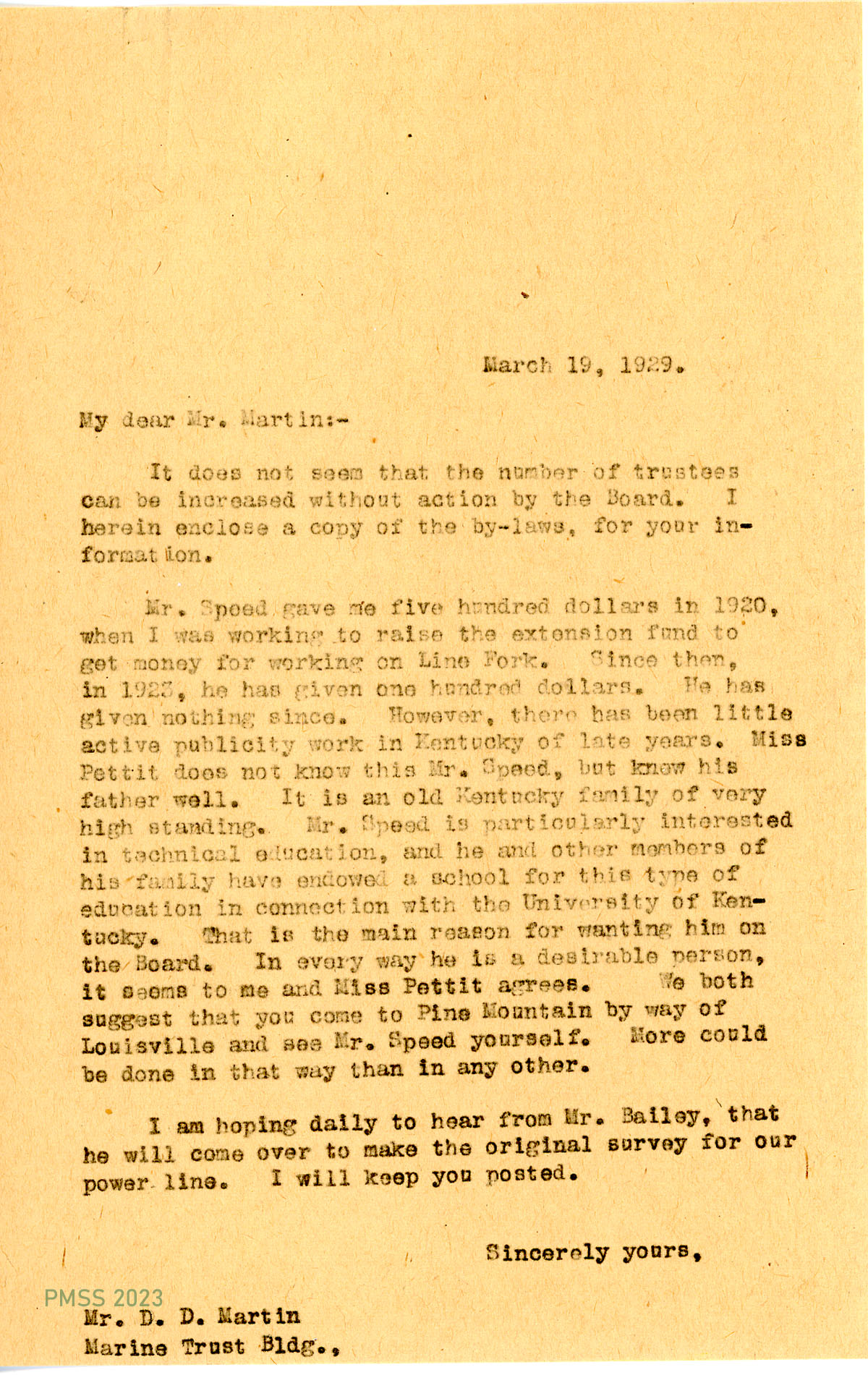 009 March 19, 1929. To Martin from [unsigned, apparently Melville], enclosing a copy of by-laws which state that the “number of trustees can be increased without action by the Board.” She writes about Mr. Speed’s giving history and background. She suggests that Martin should visit him. She is waiting to hear from Mr. Bailey, who will “make the original survey for our power line.”