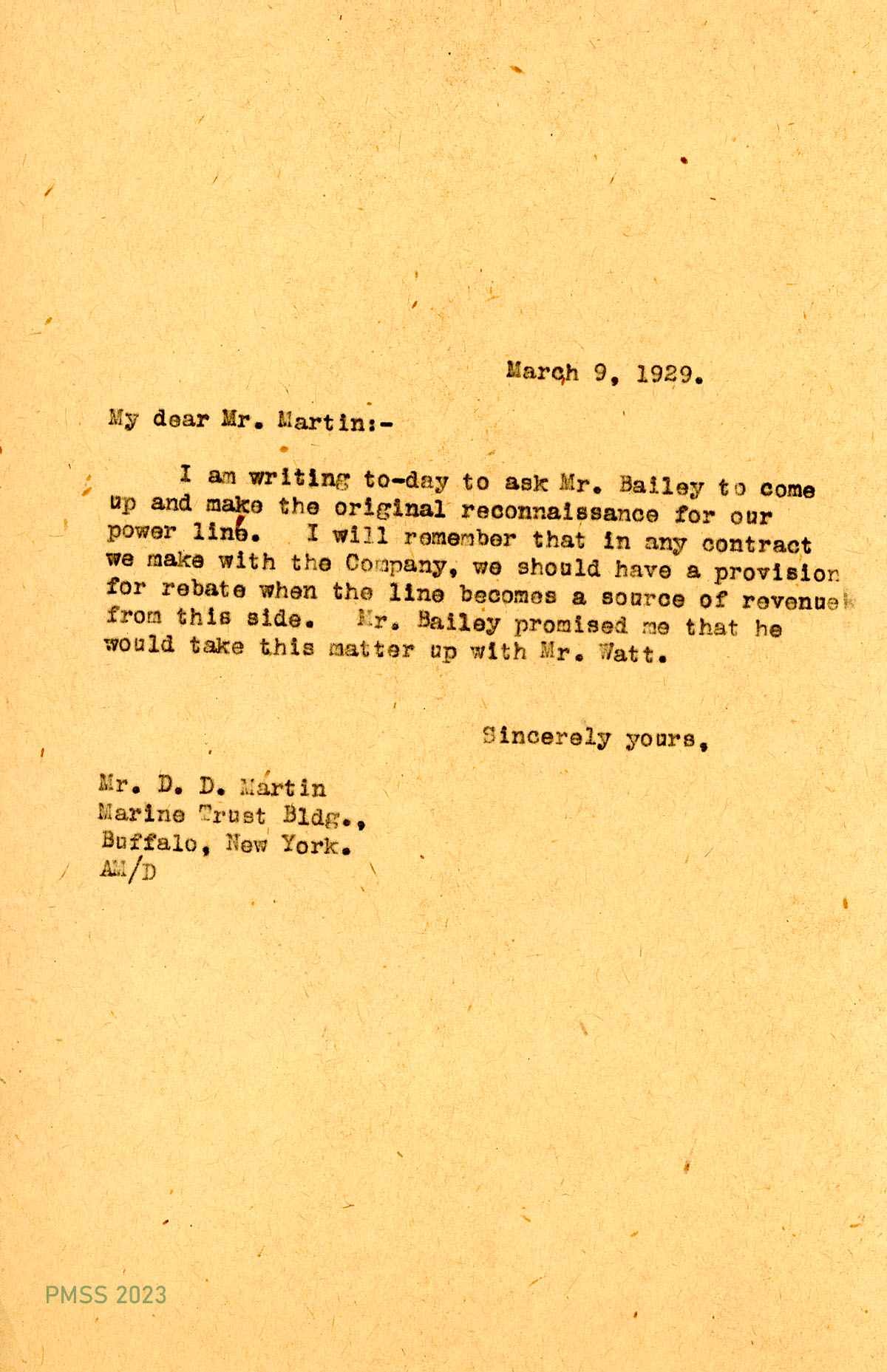 010 March 9, 1929. To Martin from AM [Melville], reporting that she plans to write to Mr. Bailey about the power line survey. “…[In] any contract we make with the Company, we should have a provision for rebate when the line becomes a source of revenue from this side. Mr. Bailey…[will] take this matter up with Mr. Watt.”