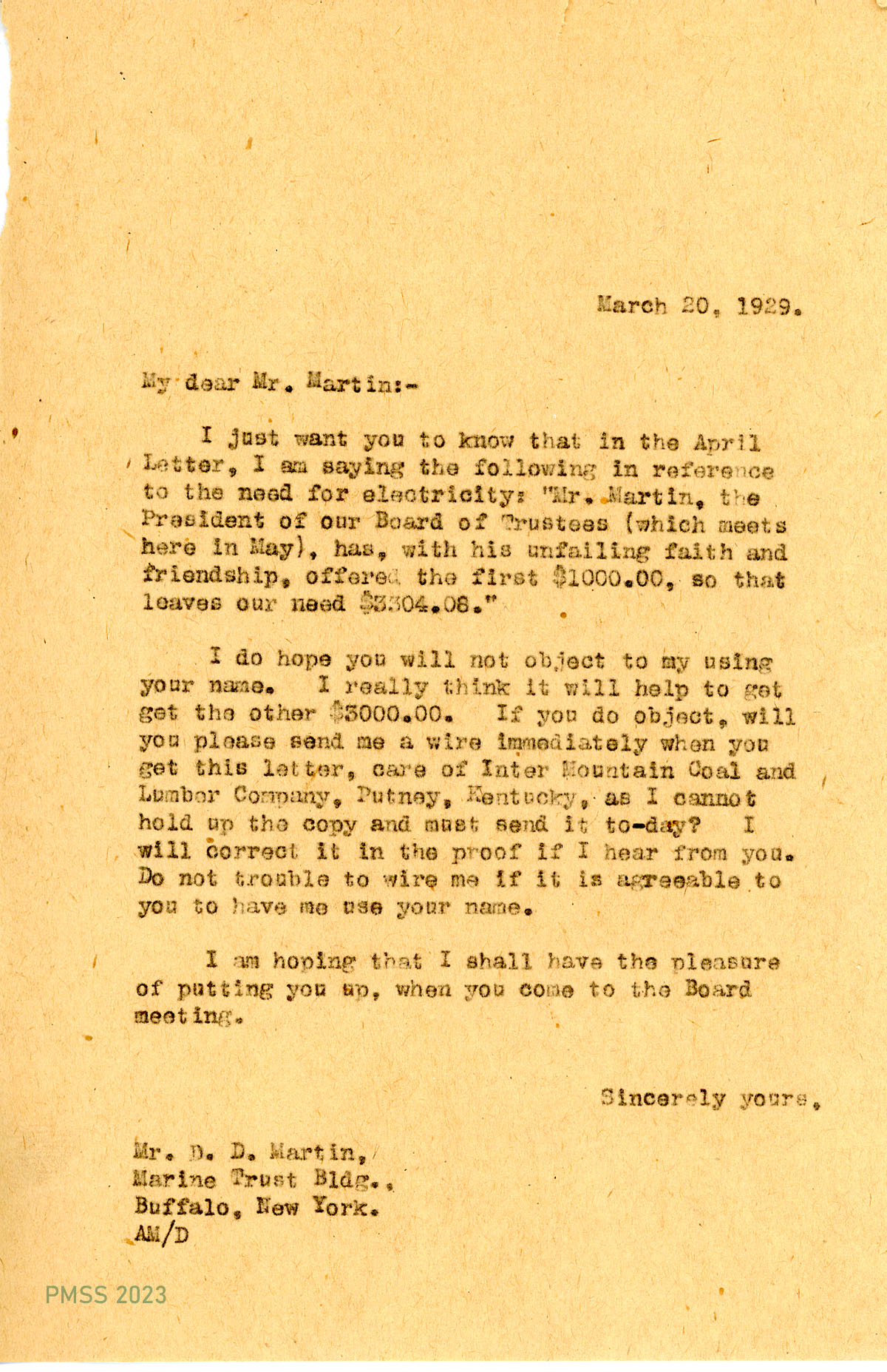 014 March 20, 1929. To Martin from AM [Melville], sending him a draft of a fundraising April Letter that includes his name as the donor of the first $1,000 to the “need for electricity” and asking him for permission to use his name. She gives him her address: “℅ Inter Mountain Coal and Lumber Company, Putney, Kentucky.”