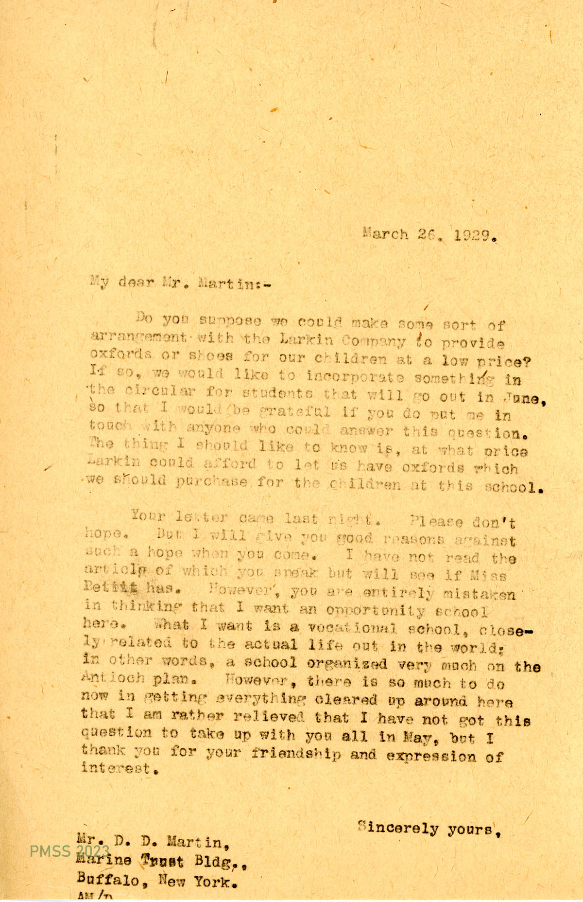 015 March 26, 1929. To Martin from AM [Melville], asking if he can arrange with Larkin Company to send “shoes for our children at a low price.” She reacts to an article Martin sent her, writing “….[H]owever, you are entirely mistaken in thinking that I want an opportunity school here. What I want is a vocational school, closely related to the actual life out in the world; in other words, a school organized very much on the Antioch plan.”