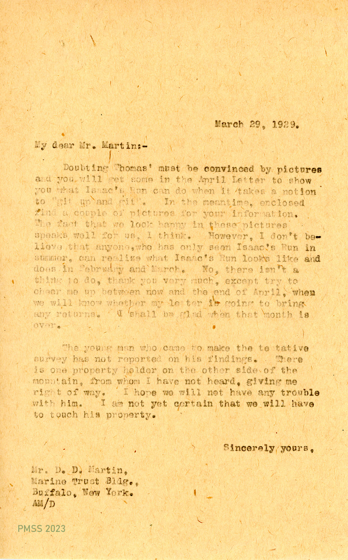 016 March 26, 1929. To Melville from Martin, surprised that Pine Mountain has flooded, due to “[i]nnocent little Isaac’s branch,” and asks what he can do.