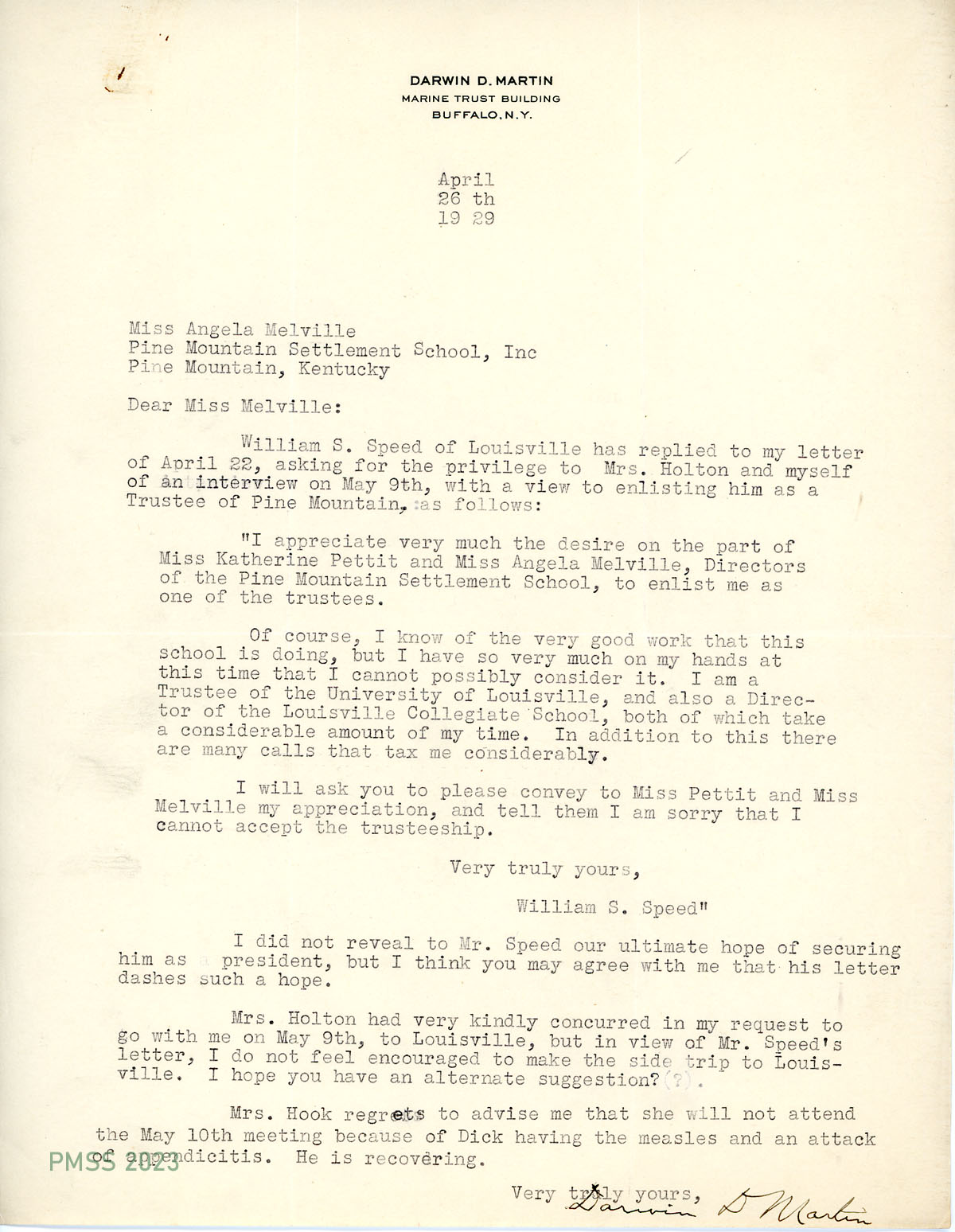 023 April 26, 1929. To Melville from Martin, reporting that William S. Speed of Louisville, has declined becoming a PMSS trustee and adds a quote from Speed’s letter explaining his reason. Mrs. Hook will not be attending the board meeting.