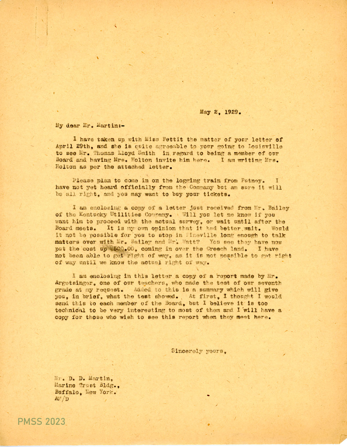 025 May 2, 1929. To Martin from AM [Melville], informing Martin that Pettit feels that he should stop in Louisville to see Mr. Thomas Lloyd Smith “in regard to being a member of our board.” Martin should take the logging train from Putney. She encloses a letter from Mr. Bailey of the Kentucky Utilities Company about scheduling the survey. Melville asks Martin to visit him and Mr. Watt about the increased cost to come over the Creech land and her need to know the “actual right of way” in order to get a right of way. She also encloses a copy of a report and summary by Mr. [Glenn] Argetsinger of his testing of 7th graders.